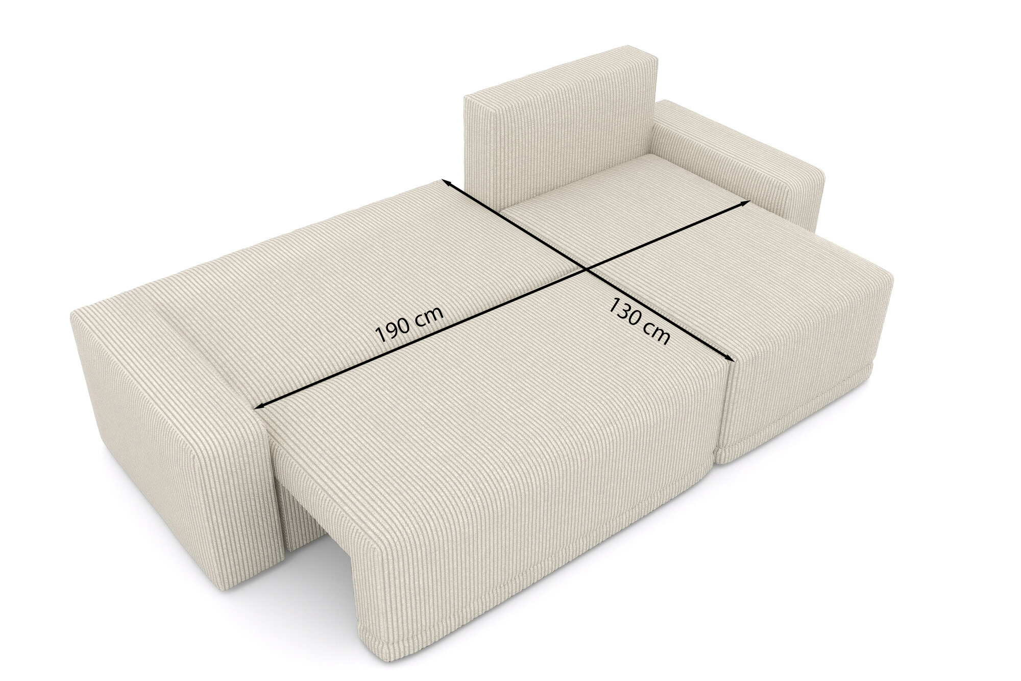 équilibréCanapé d'angle convertible TEO 4 places, avec angle réversible et coffre de rangement, en velours côtelé beige. Dimensions du canapé : 235 x 125 x 88 cm. Dimensions du couchage : 130 x 190 cm