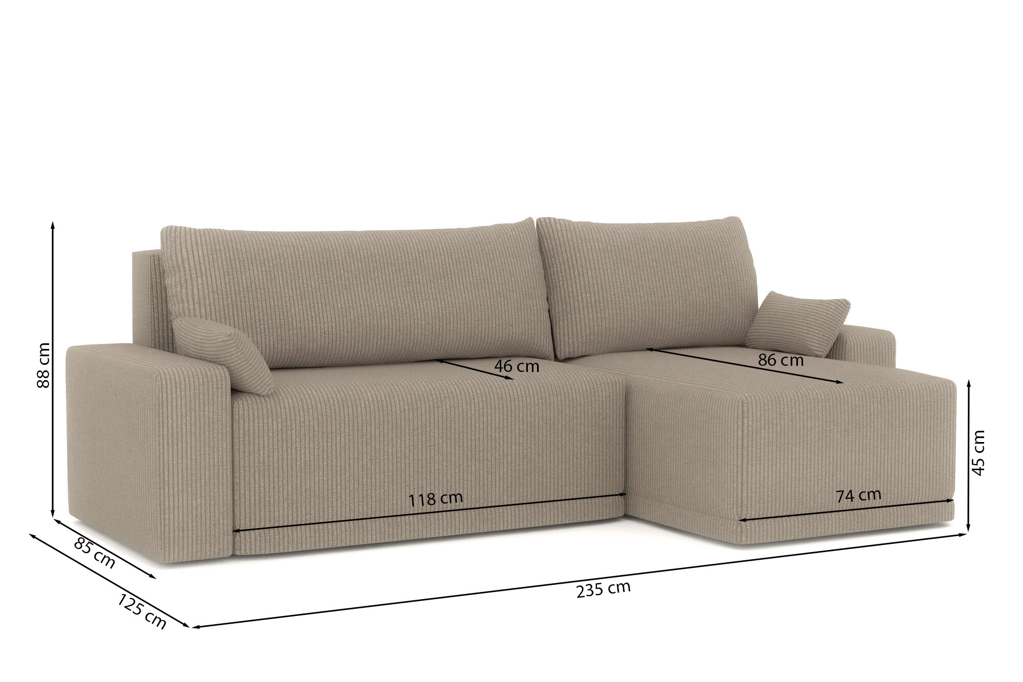 équilibréCanapé d'angle convertible TEO 4 places, avec angle réversible et coffre de rangement, en velours côtelé grège. Dimensions du canapé : 235 x 125 x 88 cm. Dimensions du couchage : 130 x 190 cm
