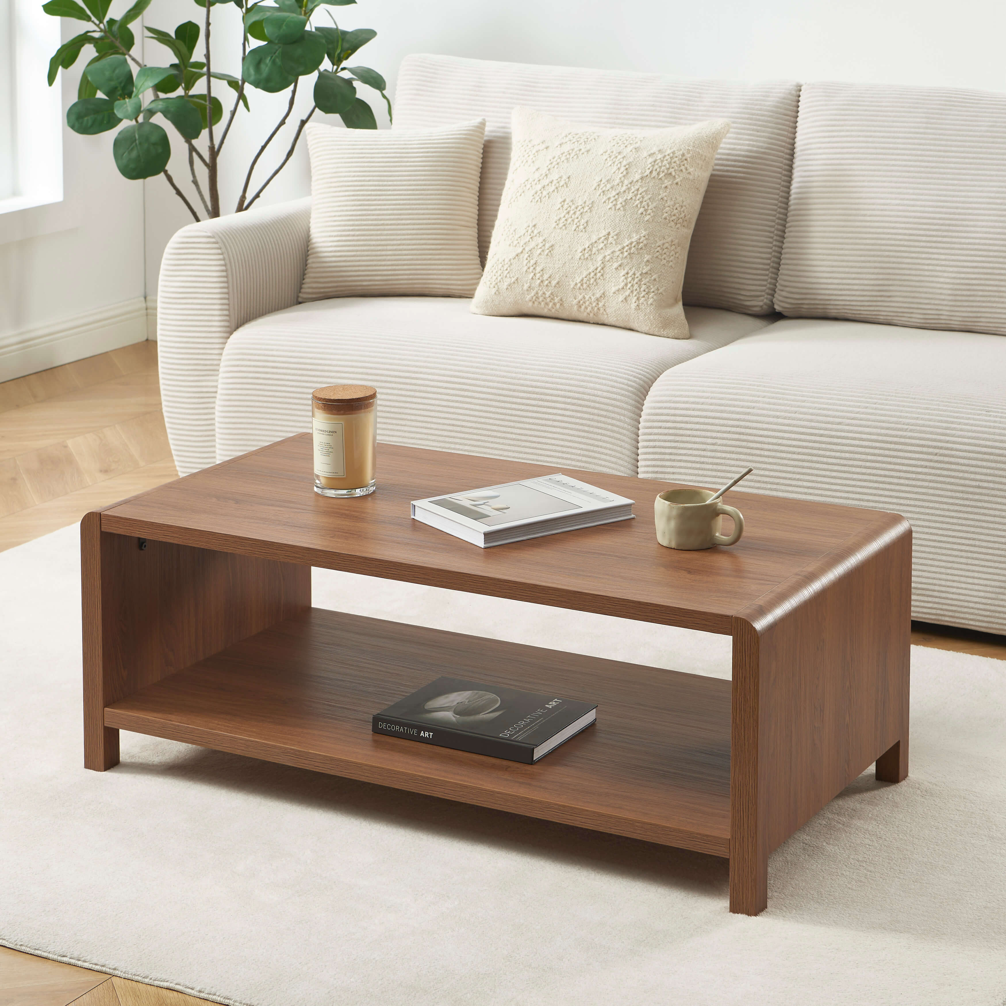 Une table basse effet noyer au style épuré, parfaite pour apporter chaleur et fonctionnalité à votre salon.