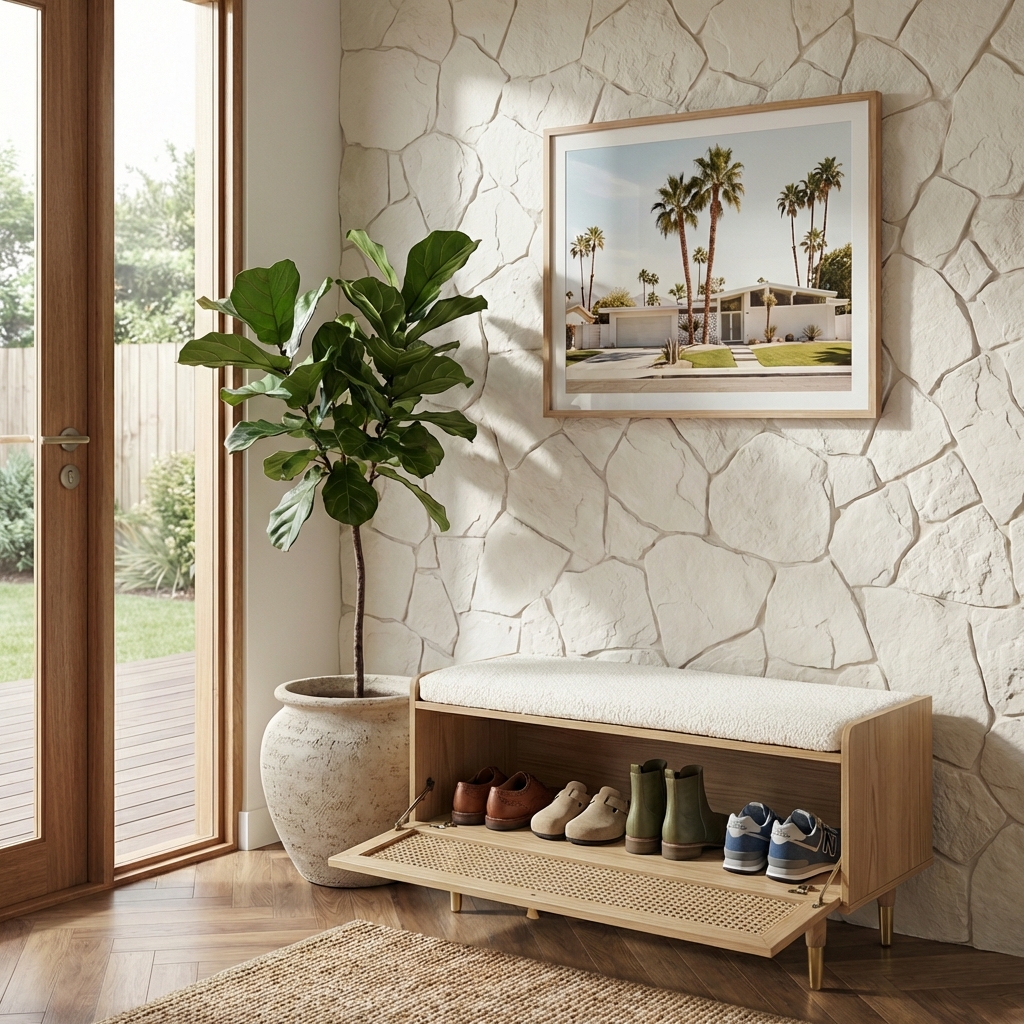 Un design chic pour un meuble à chaussures très pratique ! Le banc à chaussures LÉON, avec sa porte battante en cannage, vous permettra de ranger jusqu'à 14 paires de chaussures.
