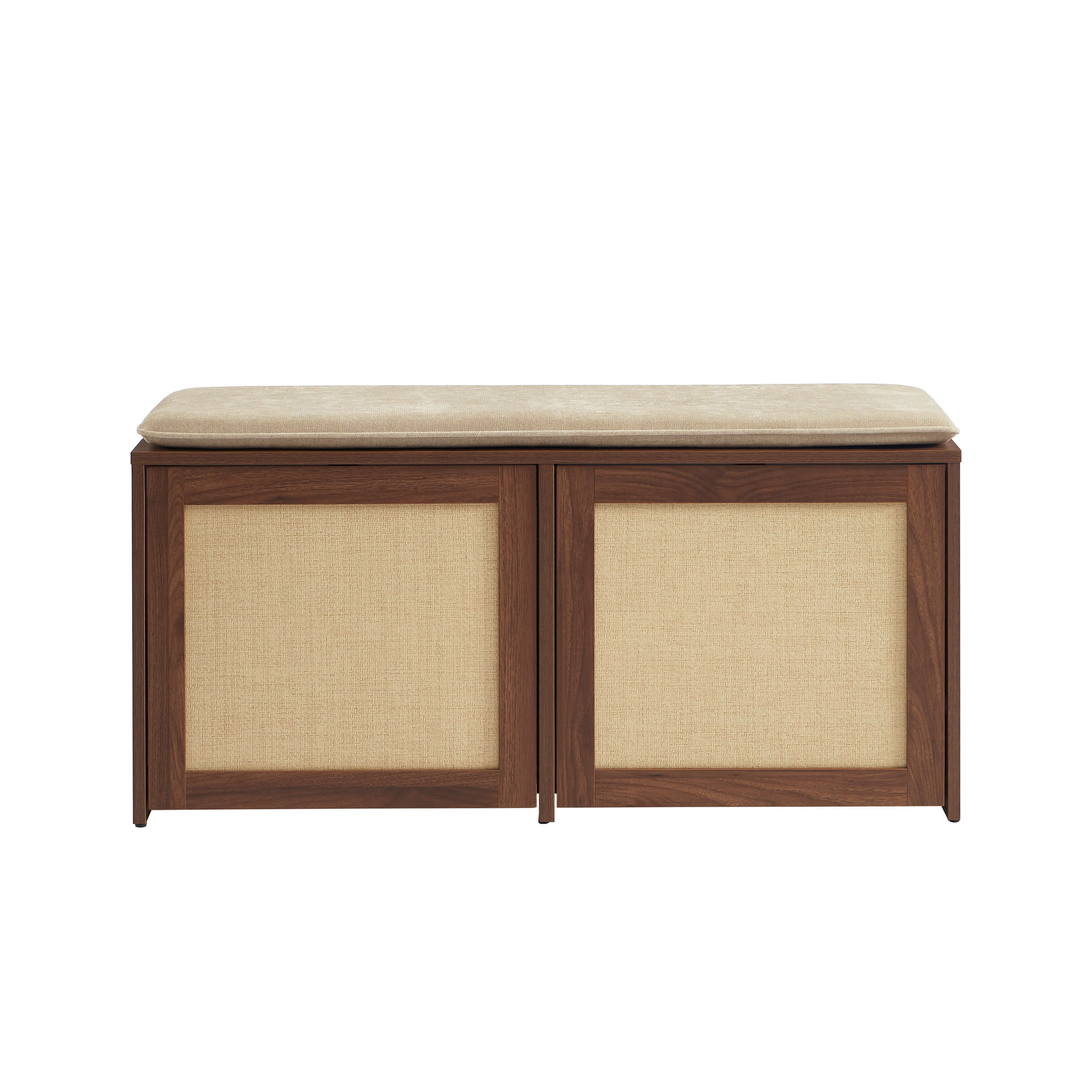 Combinez style et praticité avec le banc à chaussures HARIA. Son assise moelleuse, ses portes en rotin et son look effet noyer en font un meuble à la fois chaleureux et fonctionnel.