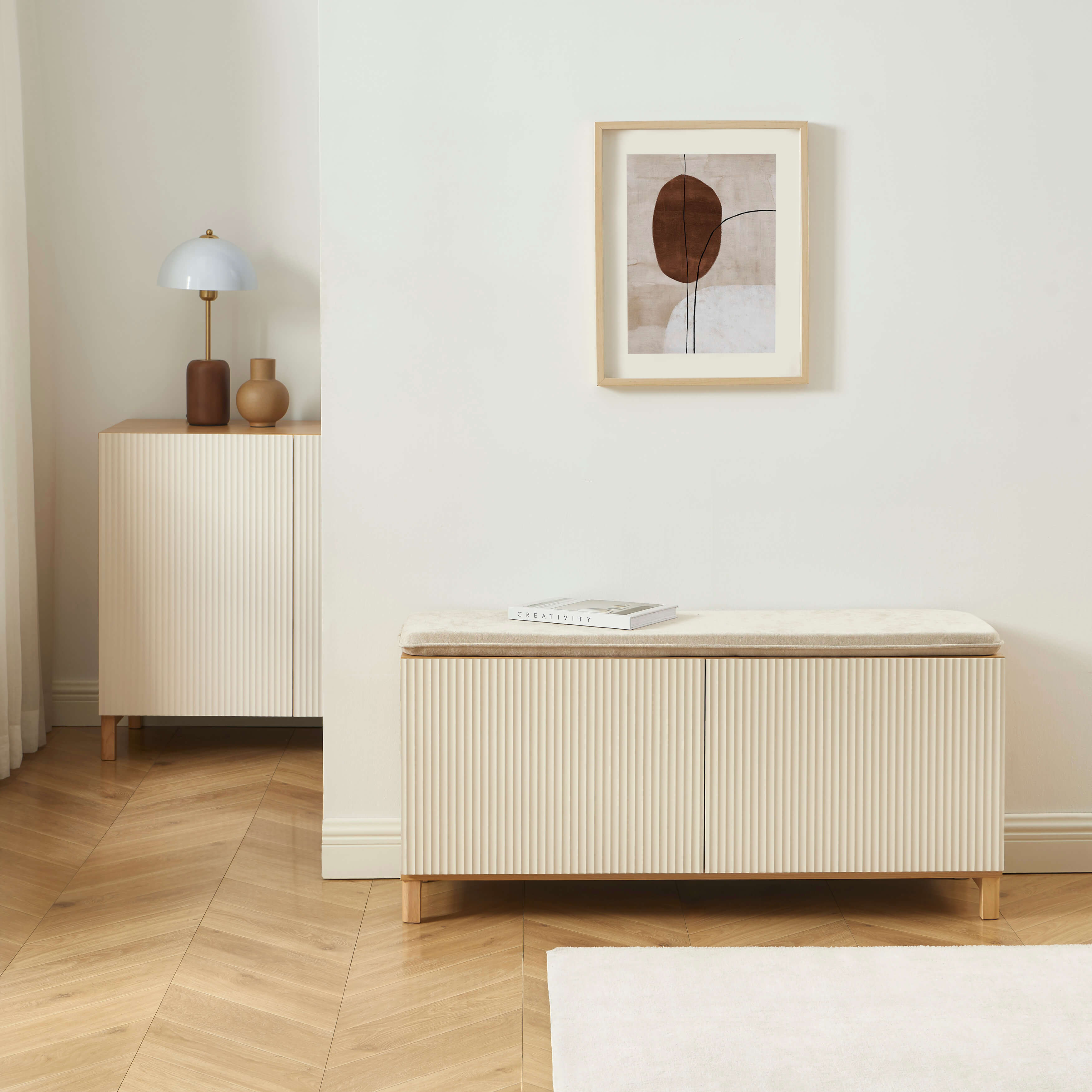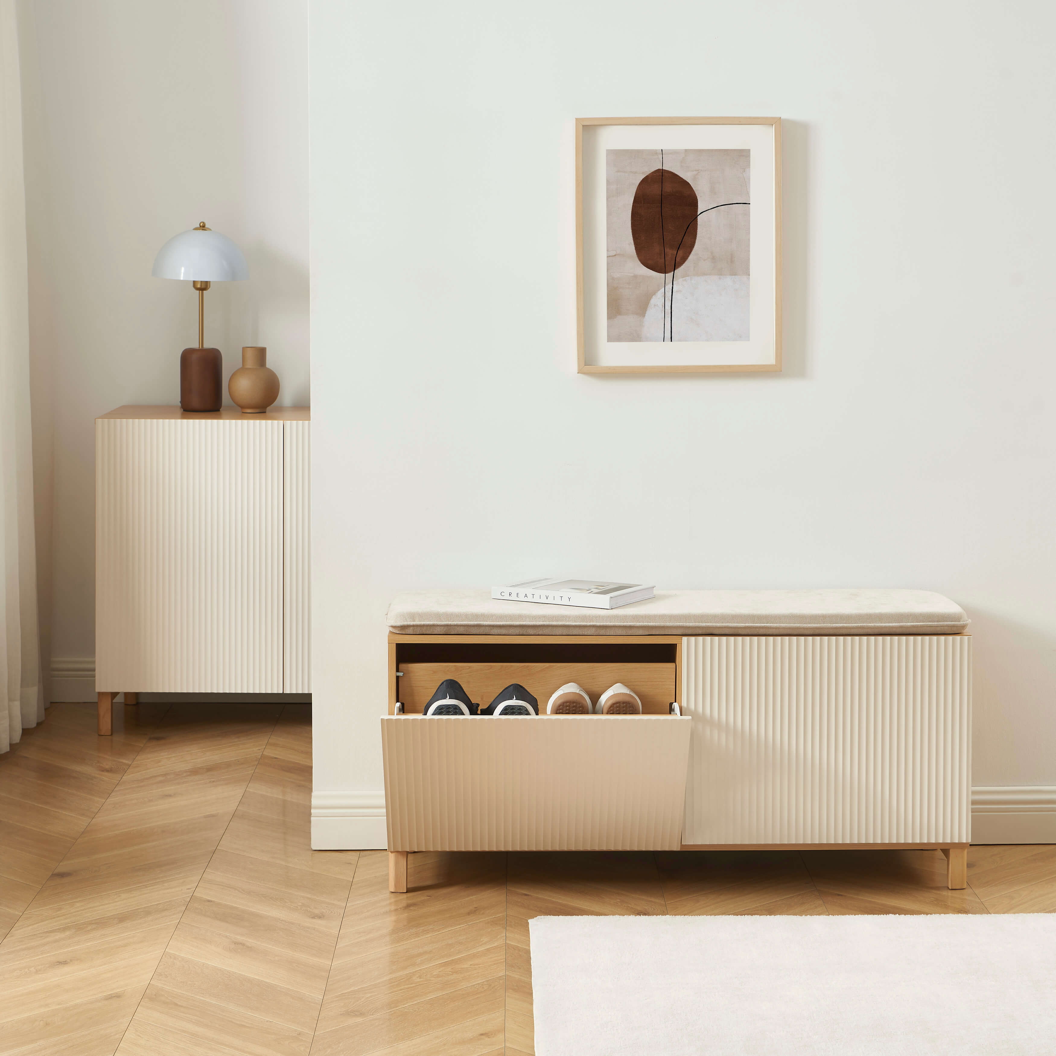 À la fois pratique et esthétique, le banc à chaussures ORCA combine assise confortable et espace de rangement. Son effet bois chêne et son coussin beige en font un meuble d’entrée chaleureux et fonctionnel.
