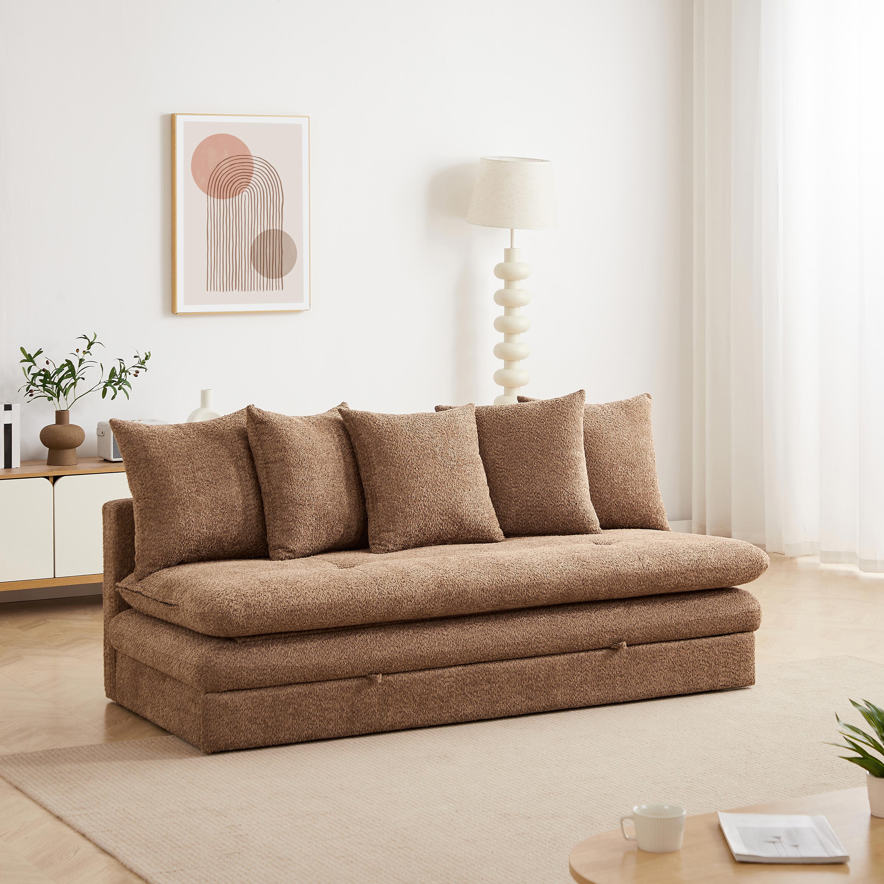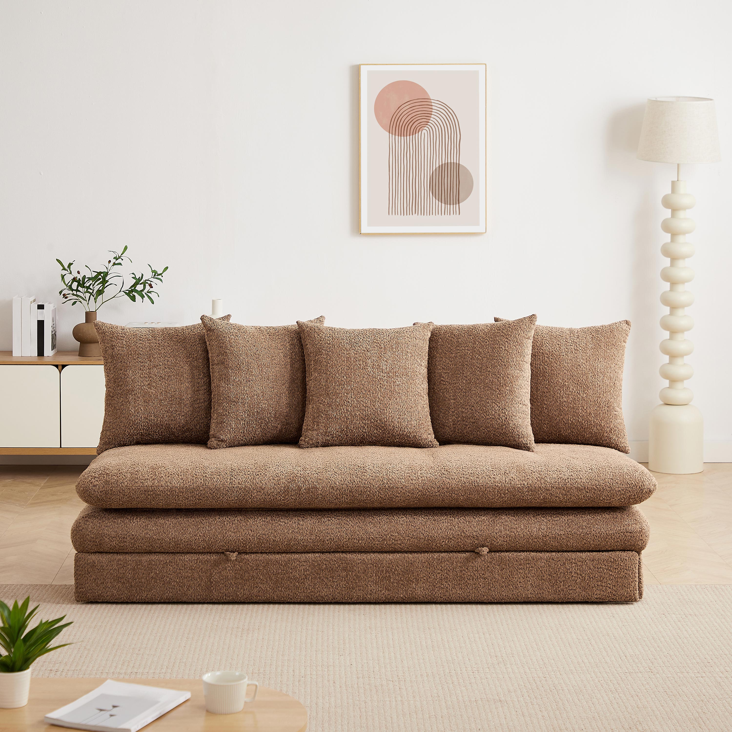 équilibréLa banquette MAORA 3 places séduit par son tissu bouclette doux et son design fonctionnel. Convertible en lit confortable, elle offre une solution pratique pour un usage quotidien ou occasionnel.