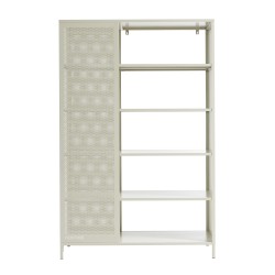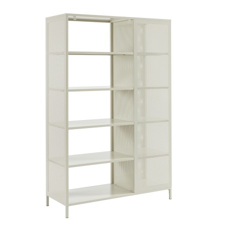 Le reste des étagères est ouvert, offrant un espace aéré pour ranger des objets plus volumineux ou décoratifs. Le côté droit du meuble présente également une façade en métal perforé, ajoutant une touche de texture au design global de l'étagère. Les pieds du meuble, également en métal beige sable, offrent une base solide et stable tout en ajoutant une note supplémentaire d'authenticité industrielle.