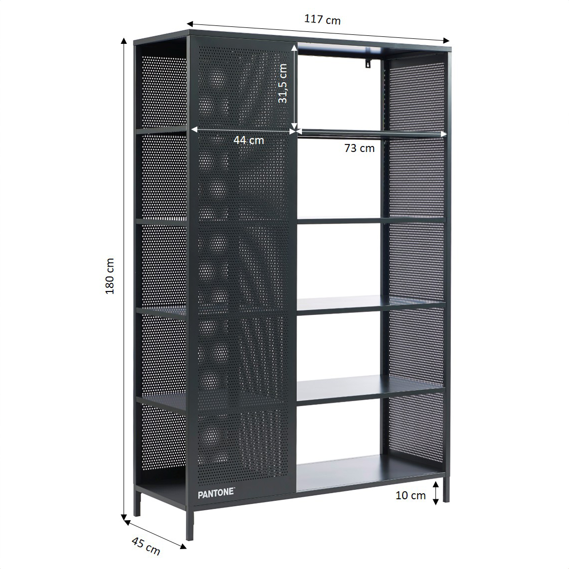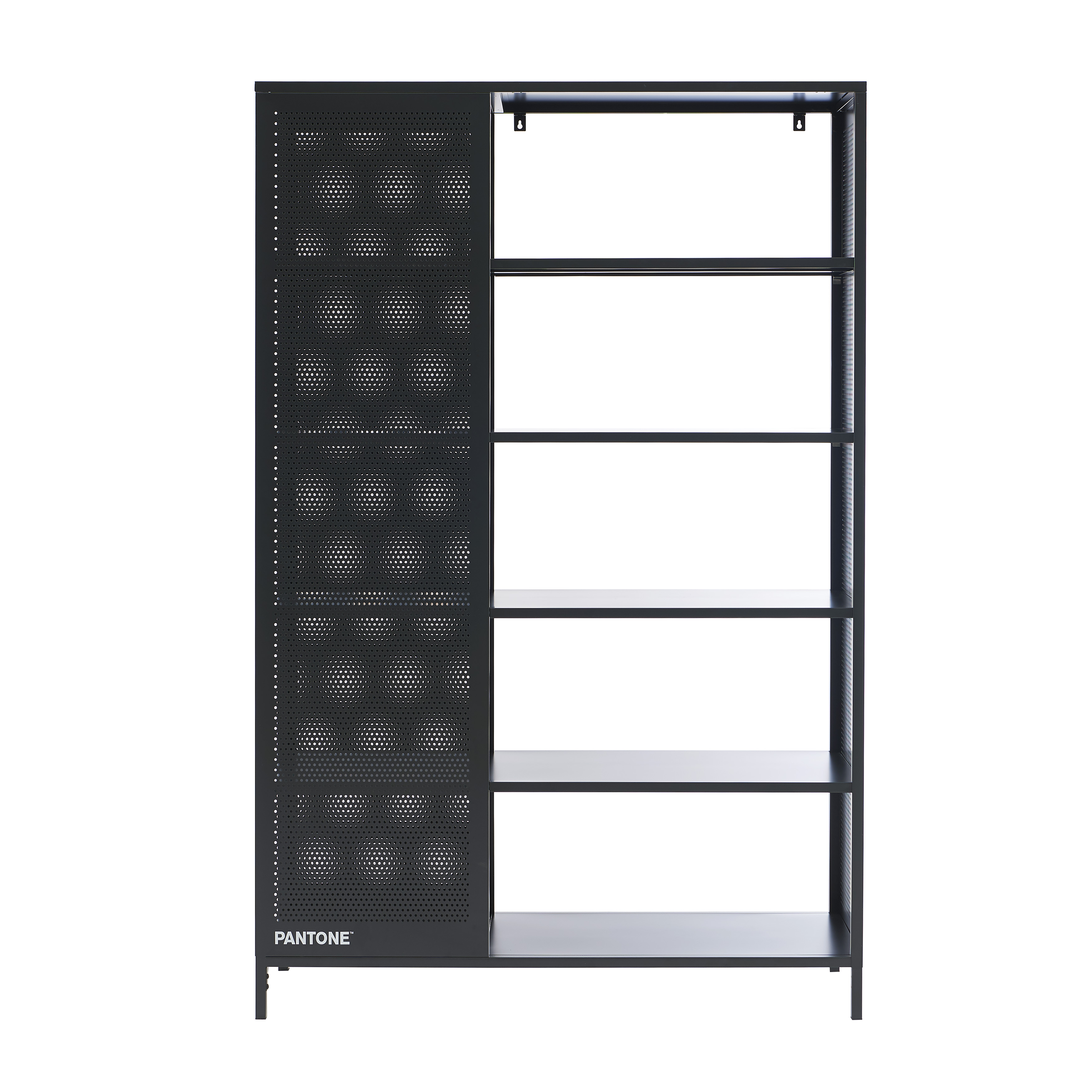 Ce qui distingue la bibliothèque PANTONE, c'est son design ingénieux et fonctionnel. Chaque étagère est divisée en deux parties : la plus petite partie est fermée devant, derrière et sur la droite par des façades en métal perforé, offrant ainsi un espace de rangement sécurisé pour les objets précieux ou fragiles. Seul le côté gauche est ouvert pour un accès facile et pratique.