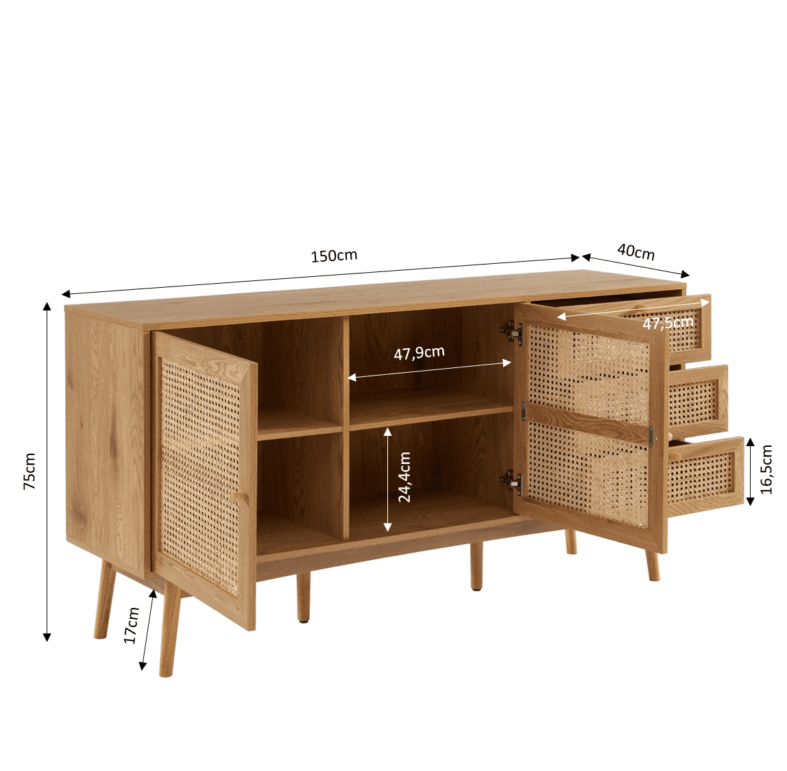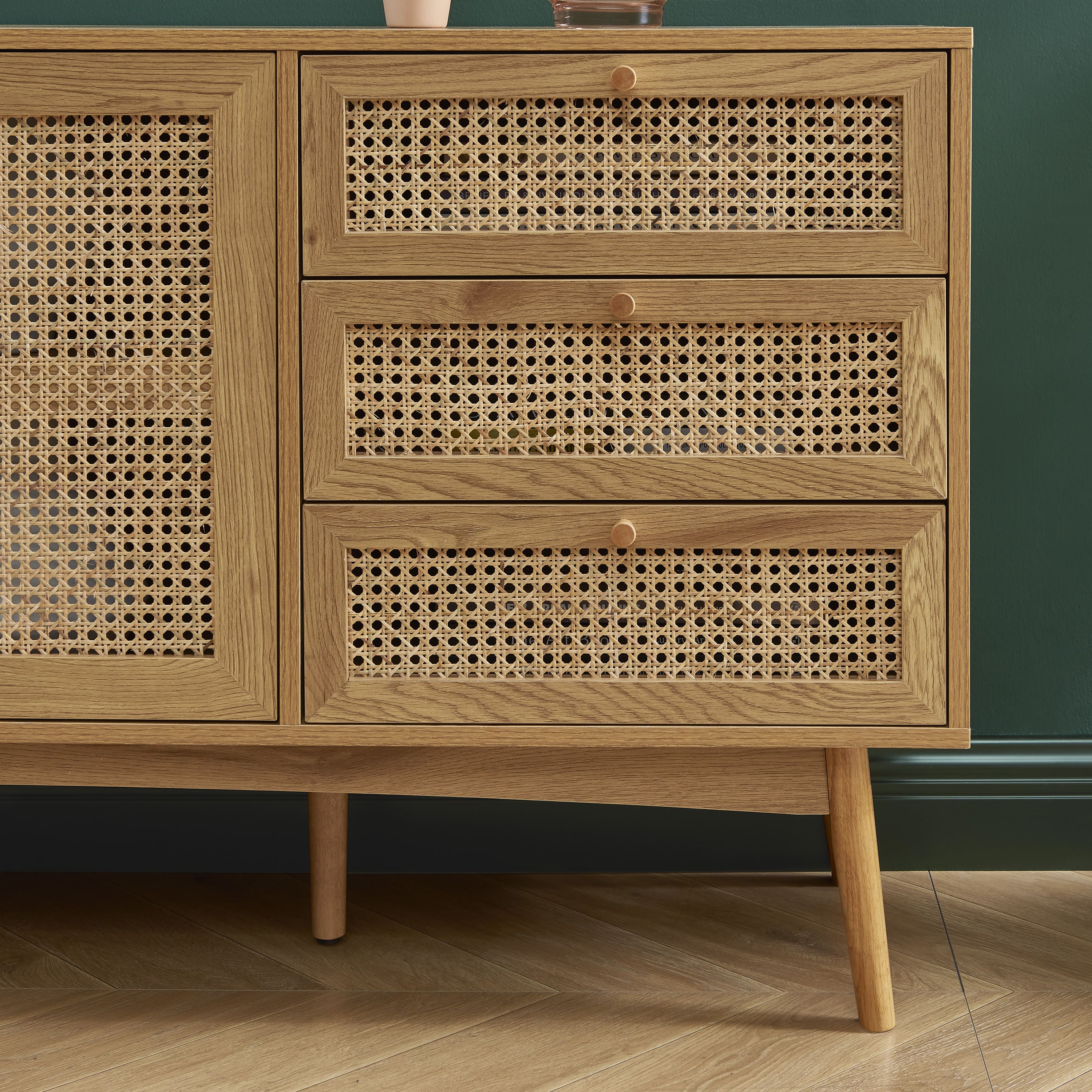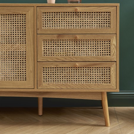 Buffet INES effet chêne et cannage rotin 2 portes 150cm