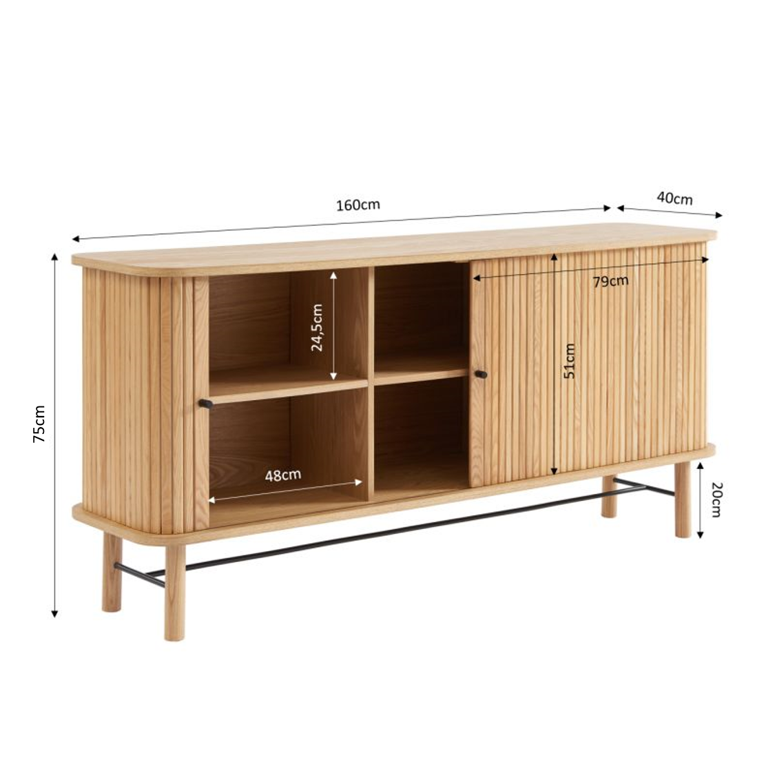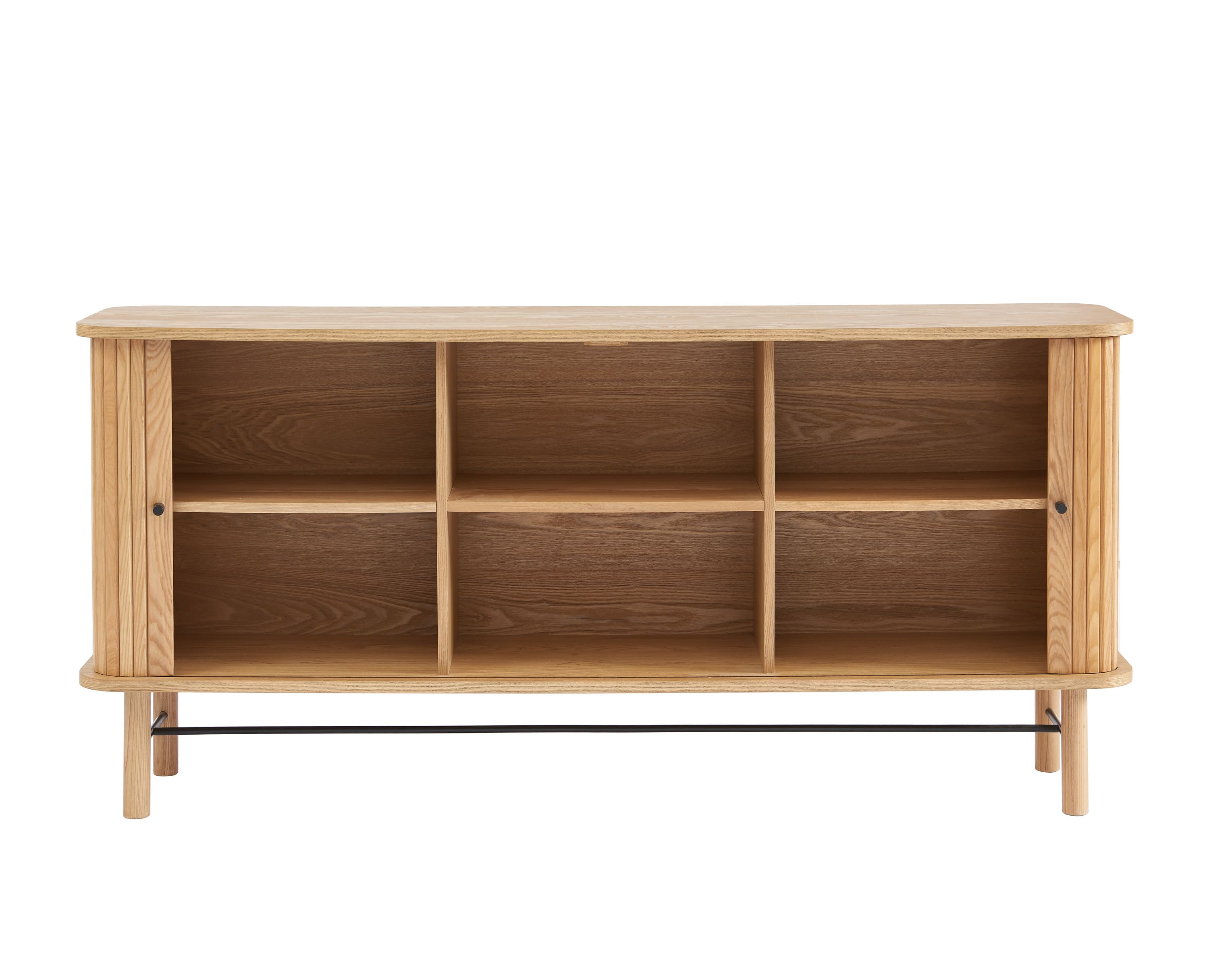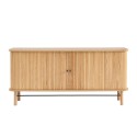 Le buffet ERNEST surf sur la tendance de l'arrondi et des portes coulissantes ! Craquez pour ce meuble aux finitions tendances, avec son placage frêne et ses poignées et pieds en métal noir.