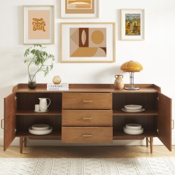 Conçu pour s’adapter à vos besoins, le buffet TWIGGY dispose de 2 portes et 3 tiroirs, vous offrant de multiples espaces de rangement. Les portes s’ouvrent sur des compartiments spacieux où vous pourrez organiser votre vaisselle, vos livres ou tout autre objet du quotidien. Les tiroirs permettent quant à eux de stocker des accessoires plus petits, tout en gardant votre espace de vie bien rangé.