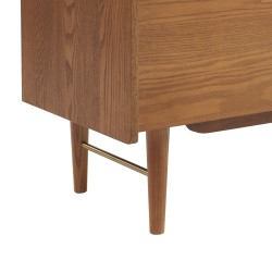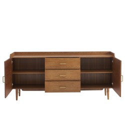 Ce buffet repose sur un piètement en bois massif, qui garantit sa stabilité tout en ajoutant une touche naturelle et authentique à l’ensemble. Les poignées en métal finition laiton apportent une note élégante et moderne, créant un contraste avec la teinte chaleureuse du frêne.