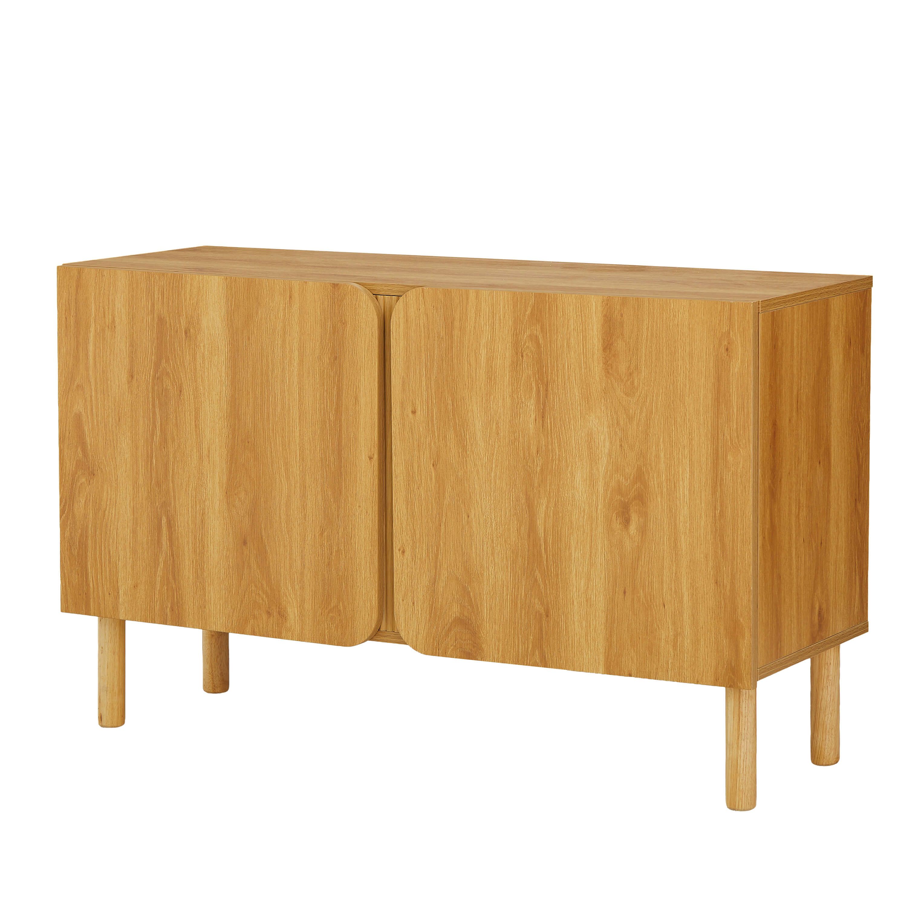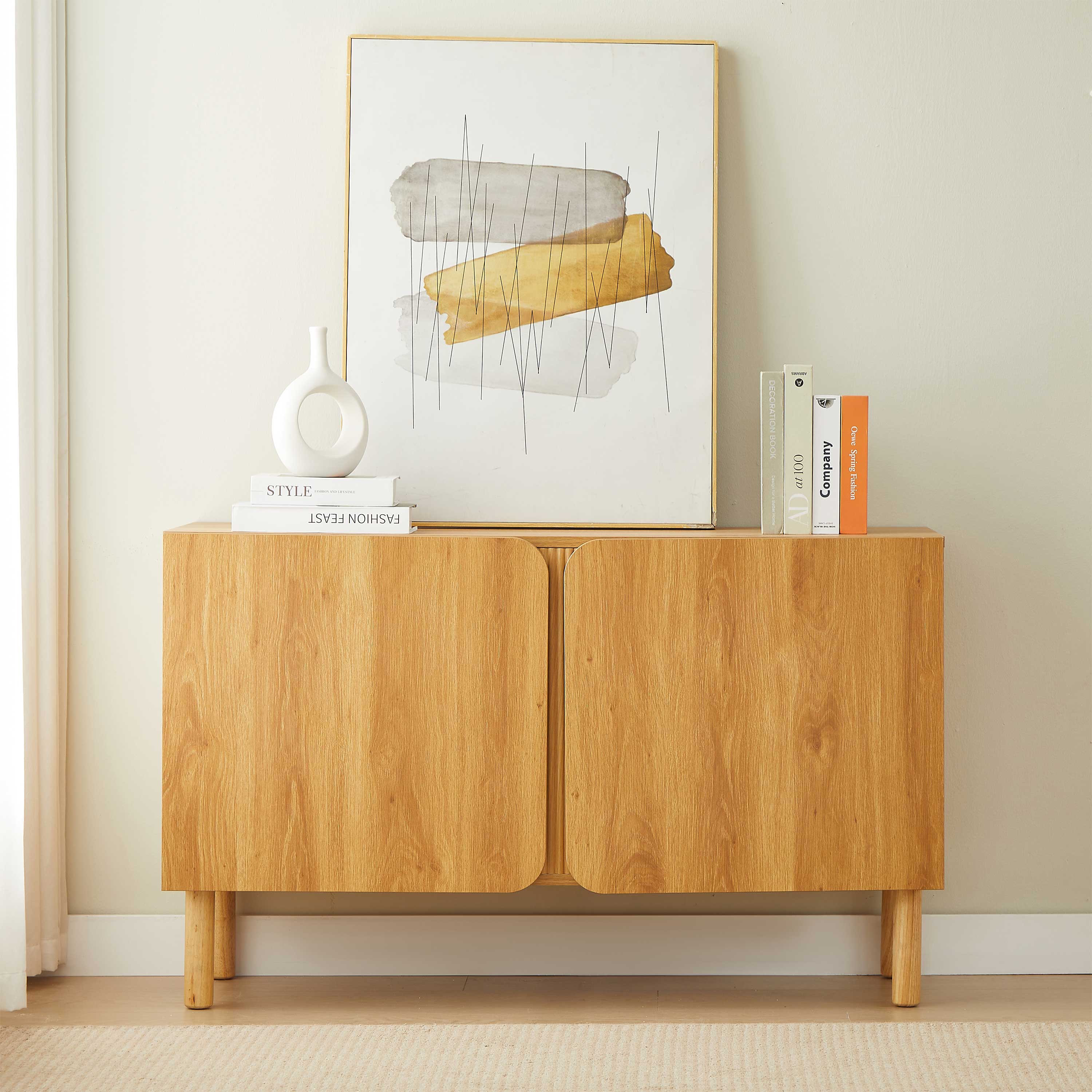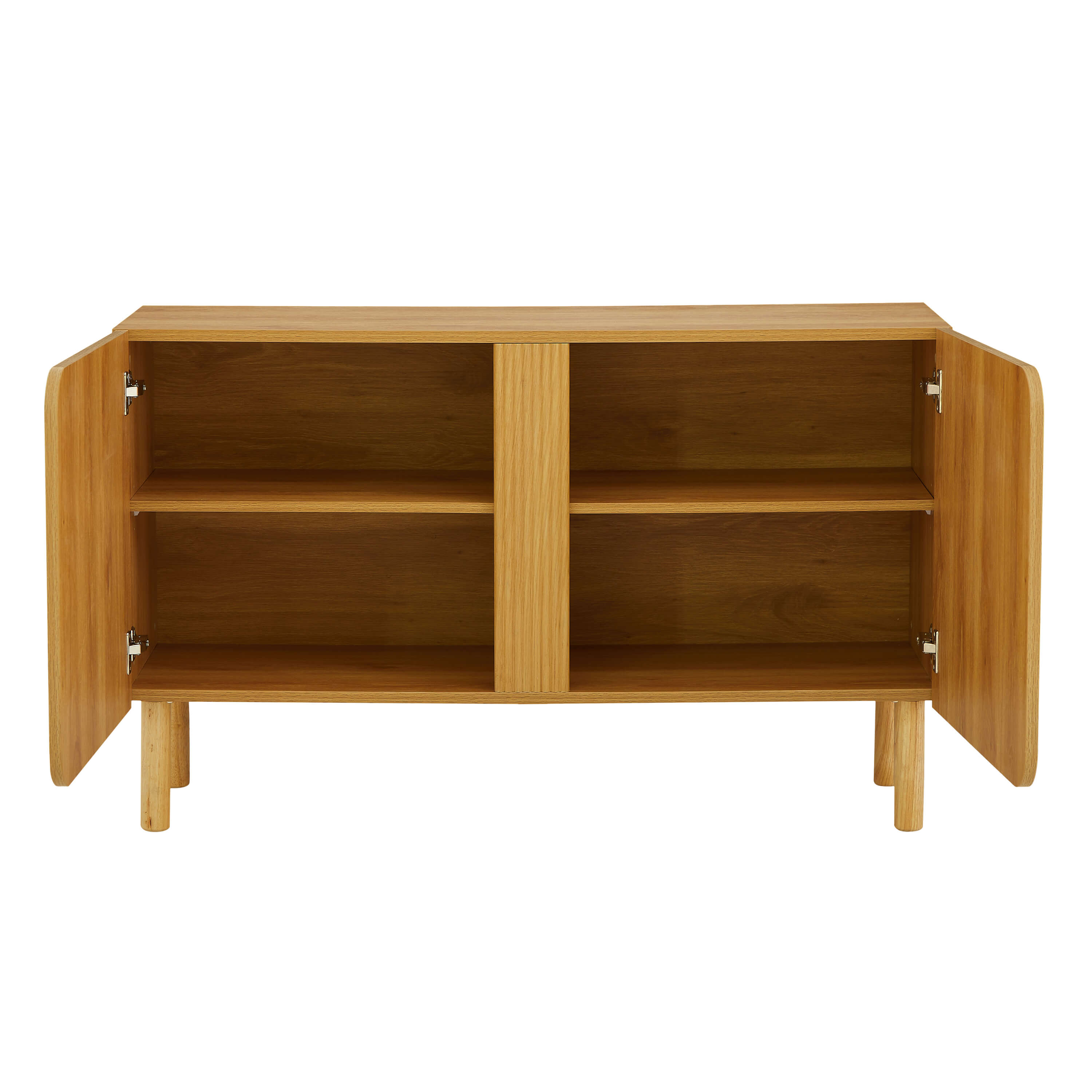 Monté sur quatre pieds cylindriques en bois de peuplier massif, complétés par un pied central discret, le buffet allie stabilité et légèreté visuelle. Les portes sans poignées renforcent son look épuré, tout en assurant une ouverture facile et fluide.