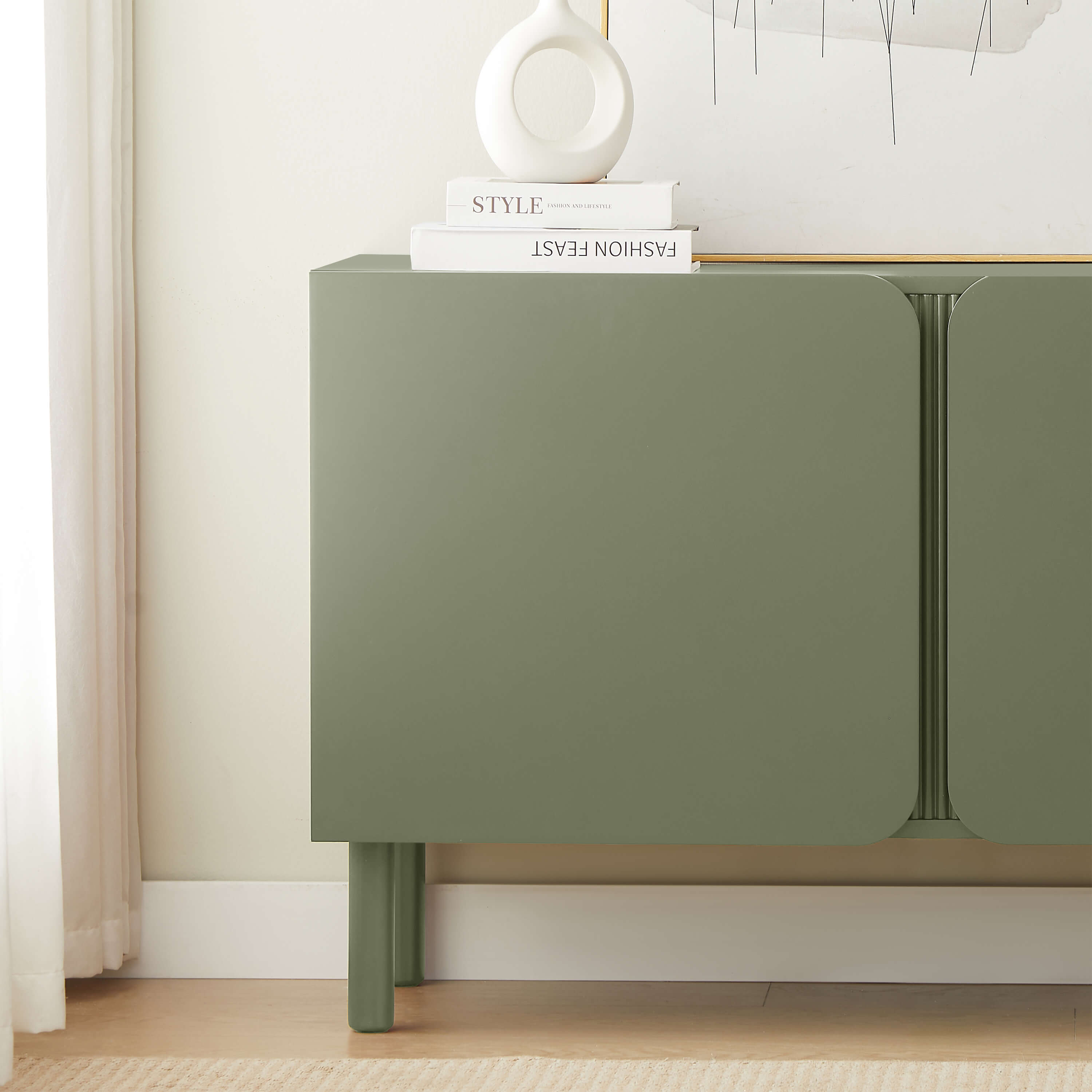 Le buffet BRAGA est monté sur quatre pieds cylindriques en bois de peuplier massif ayant la même finition colorée. Ces pieds sont complétés par un pied central discret. Les portes sans poignées renforcent son look épuré, tout en assurant une ouverture facile et fluide.