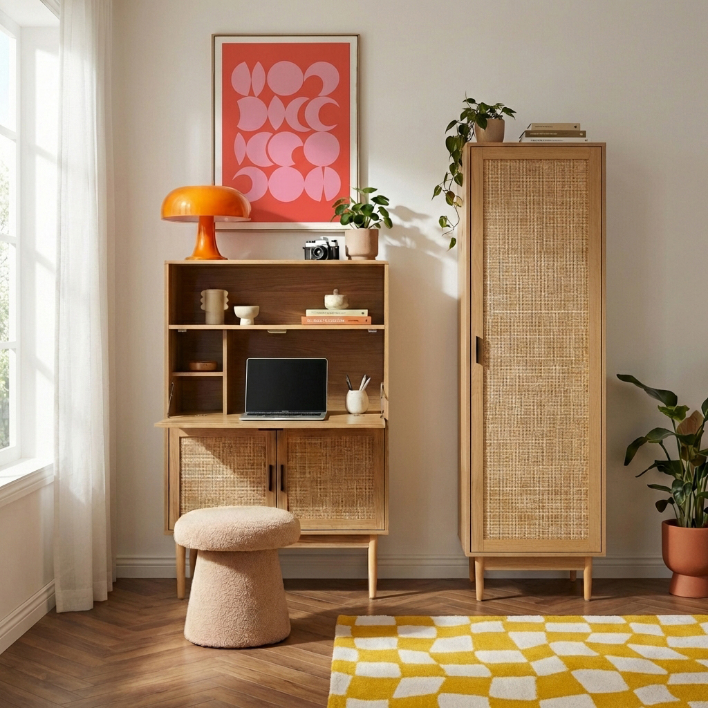 Le secrétaire AMANA se distingue par son design bohème authentique et raffiné, qui combine harmonieusement le revêtement en papier décor effet chêne et le cannage rotin. Ce style bohème apportera une touche de chaleur et de caractère à votre espace de travail, tout en s'intégrant parfaitement à divers styles d'intérieur.