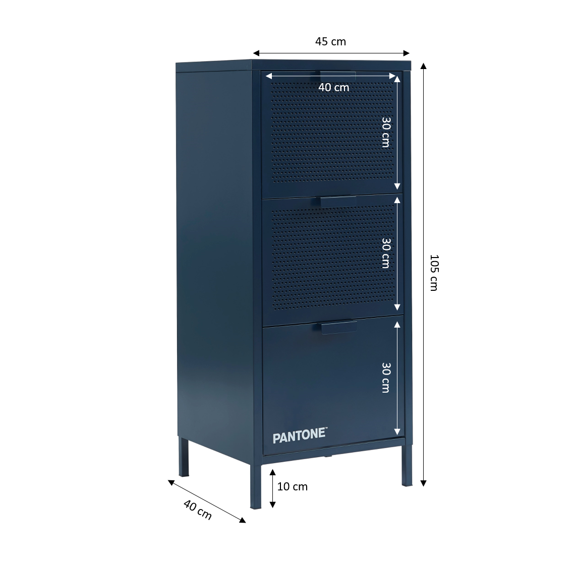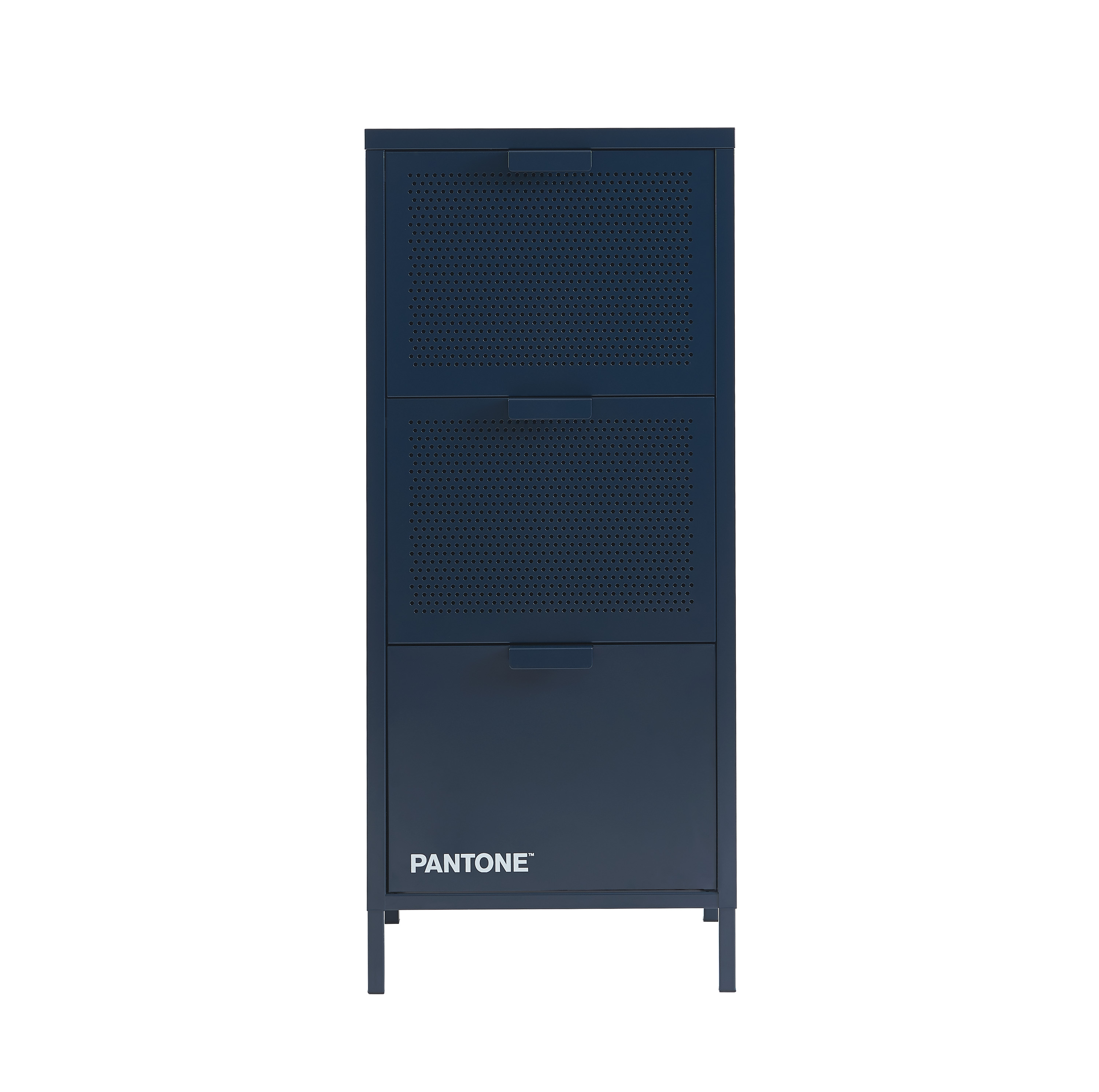 Le meuble de rangement PANTONE est équipé de trois tiroirs, offrant ainsi un espace de stockage pratique et organisé pour vos affaires. Deux des tiroirs ont une façade en métal perforé, ajoutant une touche de texture au design du meuble, tandis que le troisième tiroir a une façade en métal pleine pour un look plus solide et traditionnel.