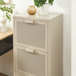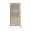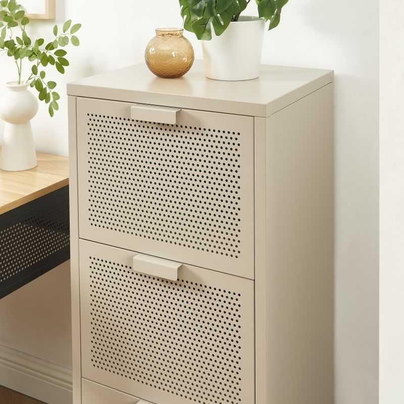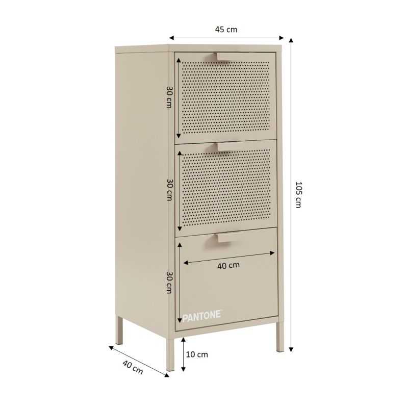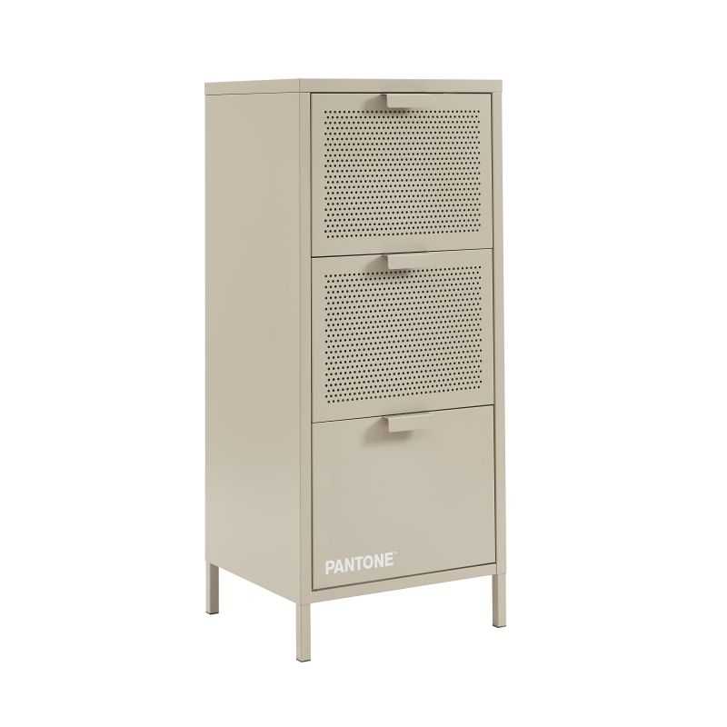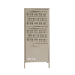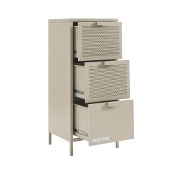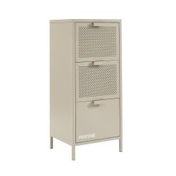 Le meuble de rangement PANTONE est équipé de trois tiroirs, offrant ainsi un espace de stockage pratique et organisé pour vos affaires. Deux des tiroirs ont une façade en métal perforé, ajoutant une touche de texture au design du meuble, tandis que le troisième tiroir a une façade en métal pleine pour un look plus solide et traditionnel.