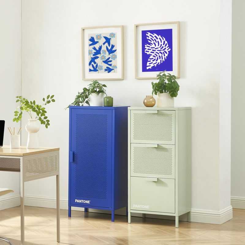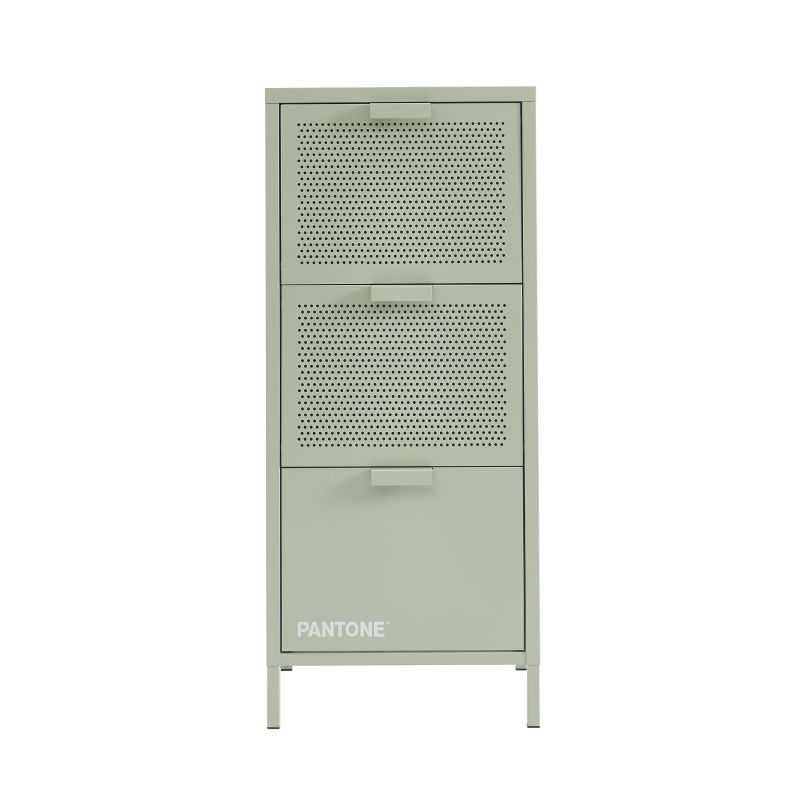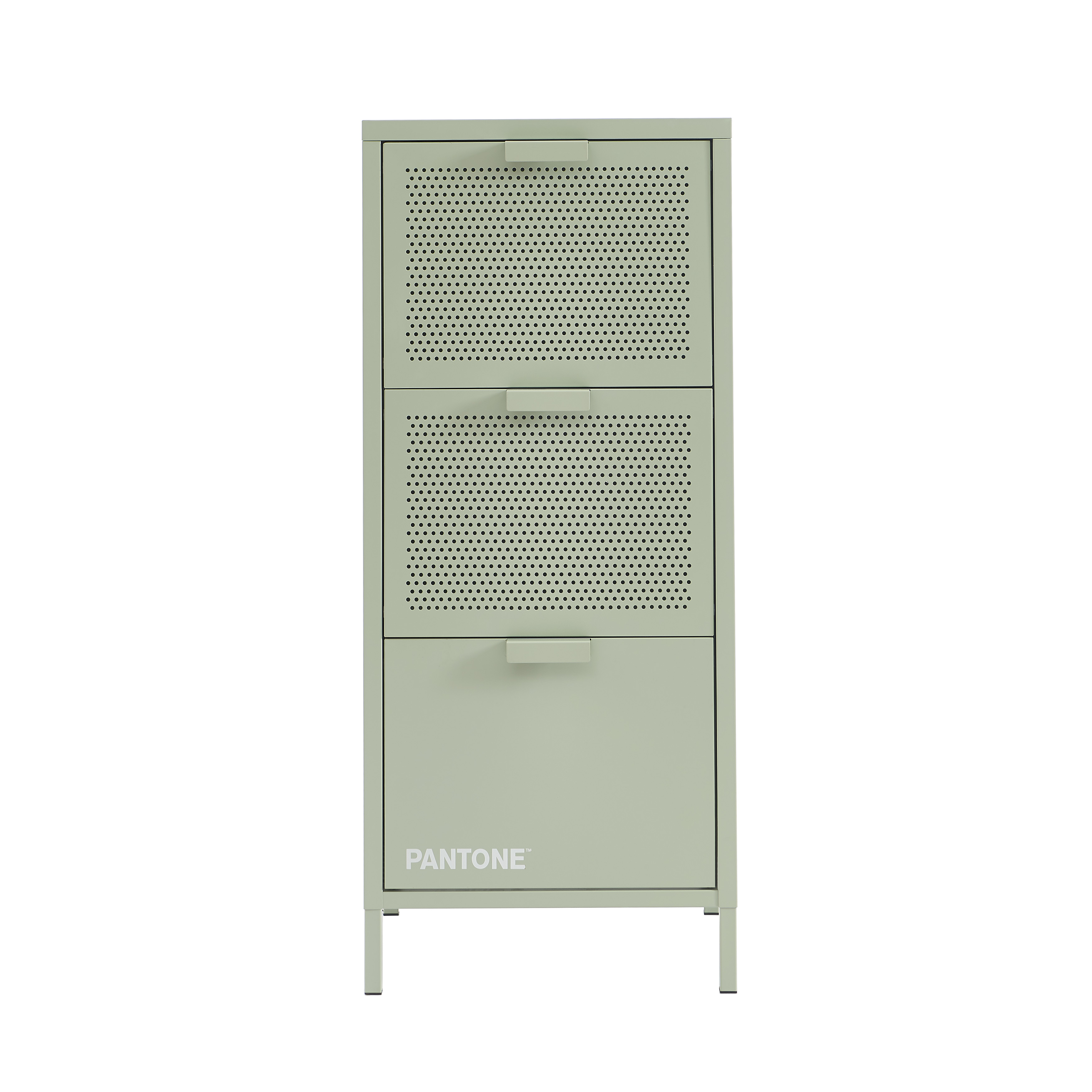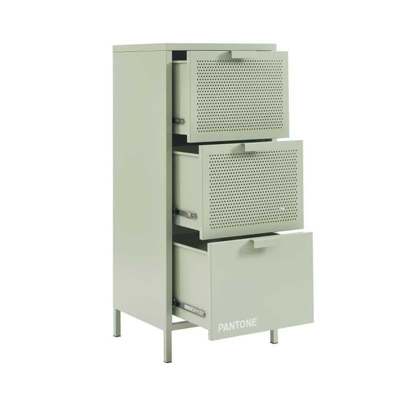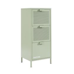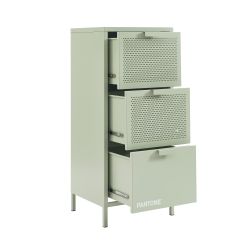 Le meuble de rangement PANTONE est équipé de trois tiroirs, offrant ainsi un espace de stockage pratique et organisé pour vos affaires. Deux des tiroirs ont une façade en métal perforé, ajoutant une touche de texture au design du meuble, tandis que le troisième tiroir a une façade en métal pleine pour un look plus solide et traditionnel.