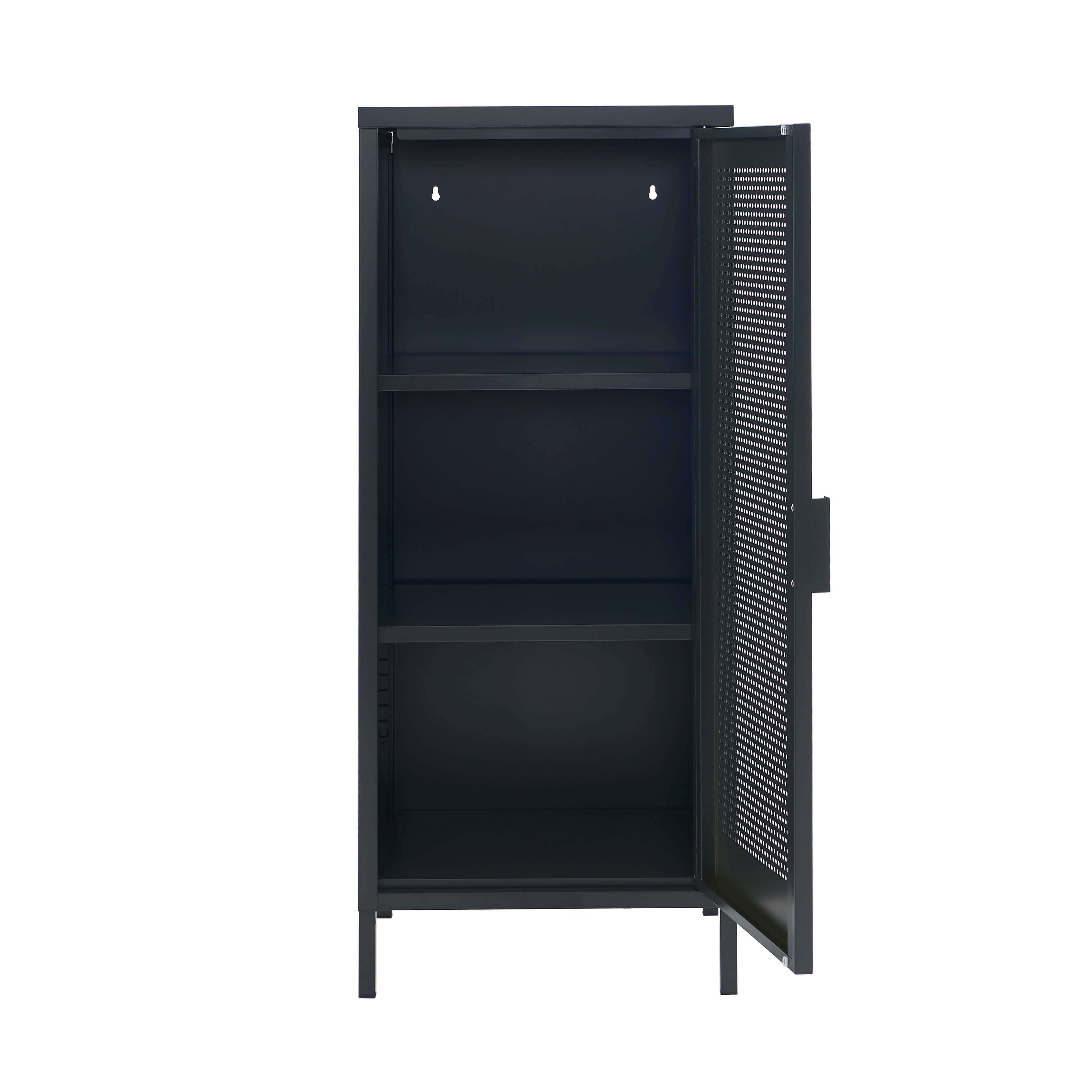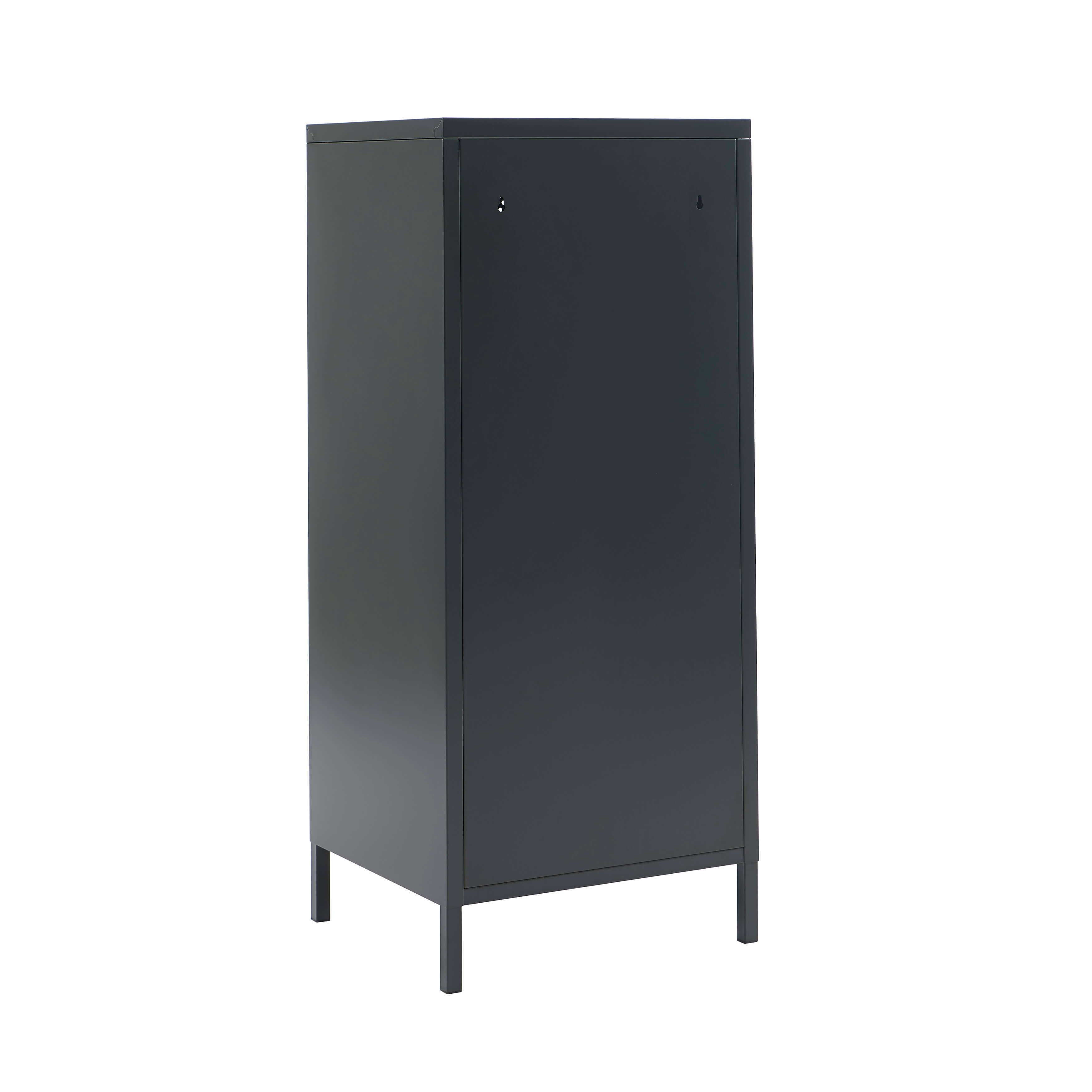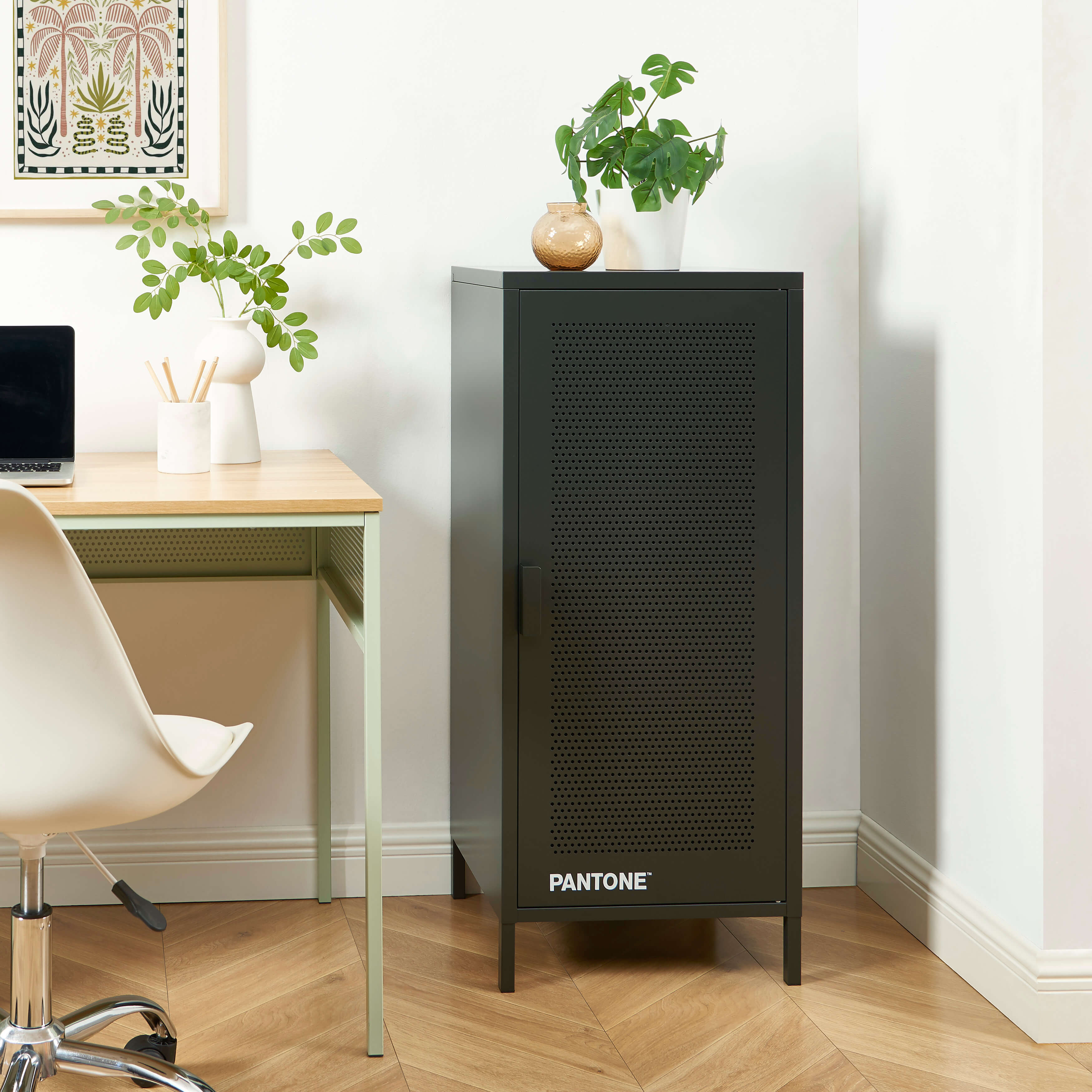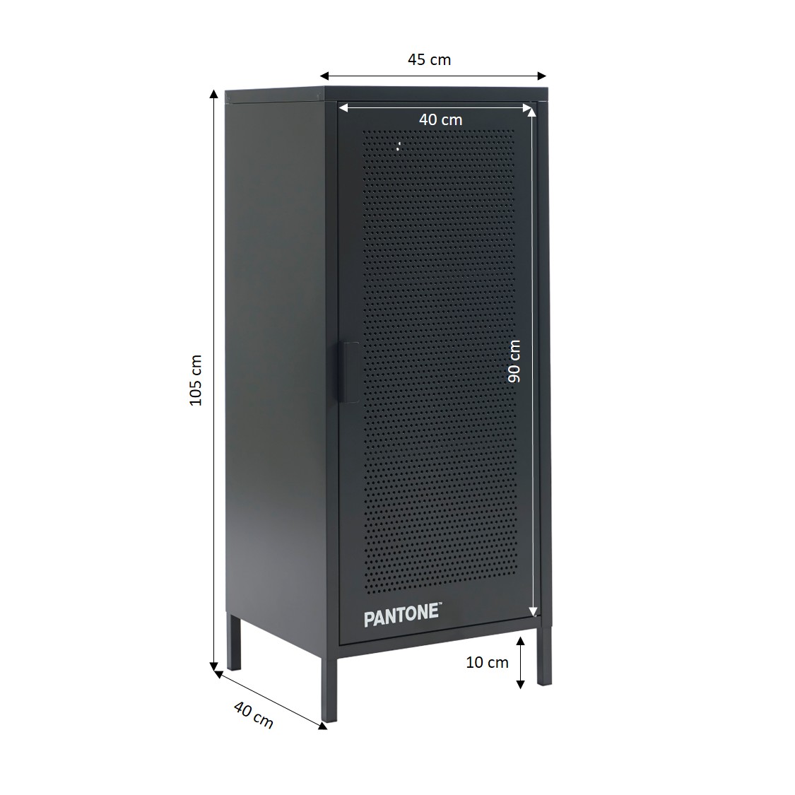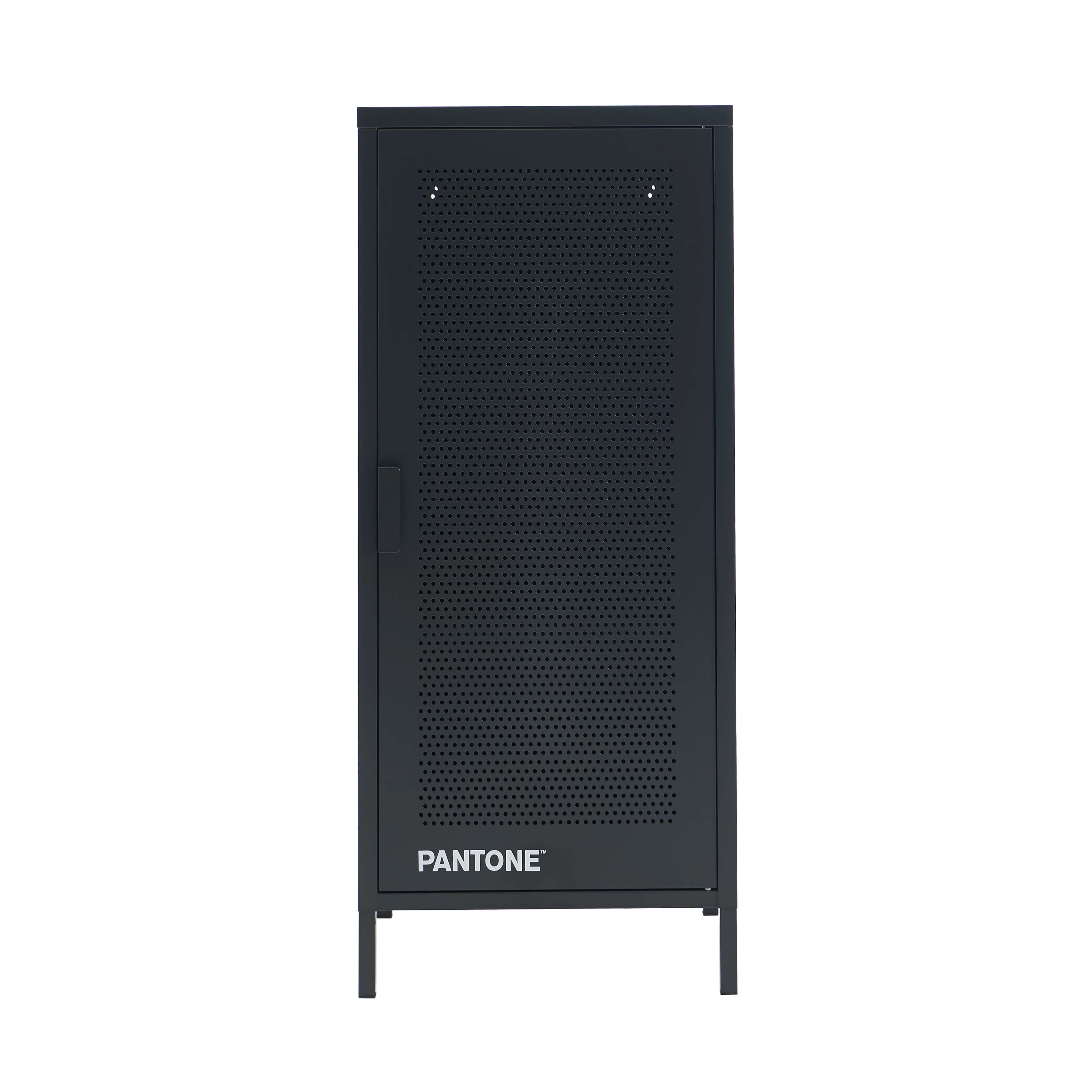 La porte en acier perforé du meuble PANTONE renforce encore le style industriel tandis que les pieds en métal assurent sa stabilité.