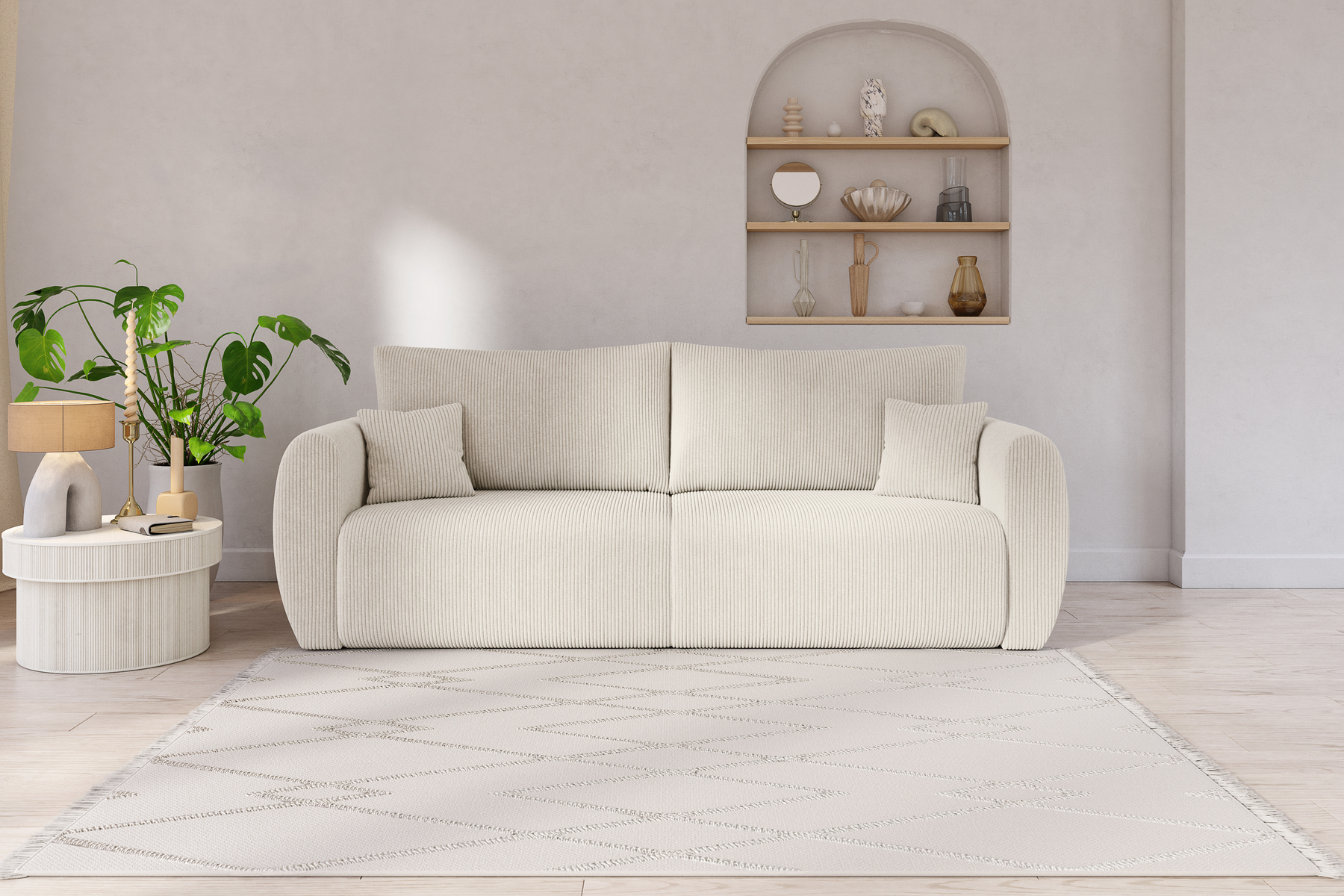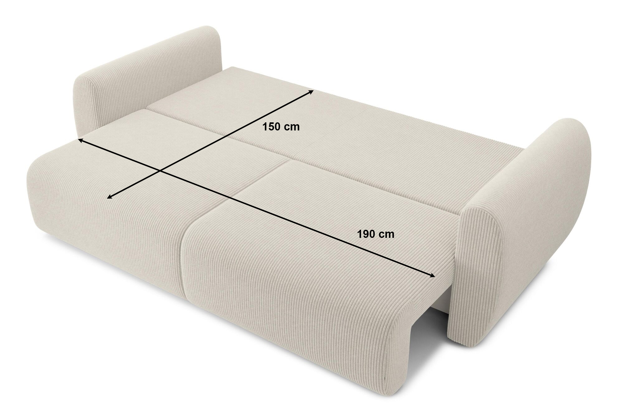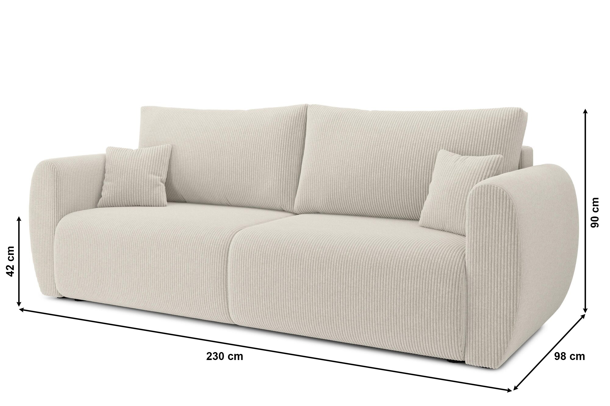 équilibréCanapé droit convertible REFA 3 places avec coffre de rangement, en velours côtelé beige. Dimensions du canapé : 230 x 98 x 90 cm. Dimensions couchage : 150 x 190 cm