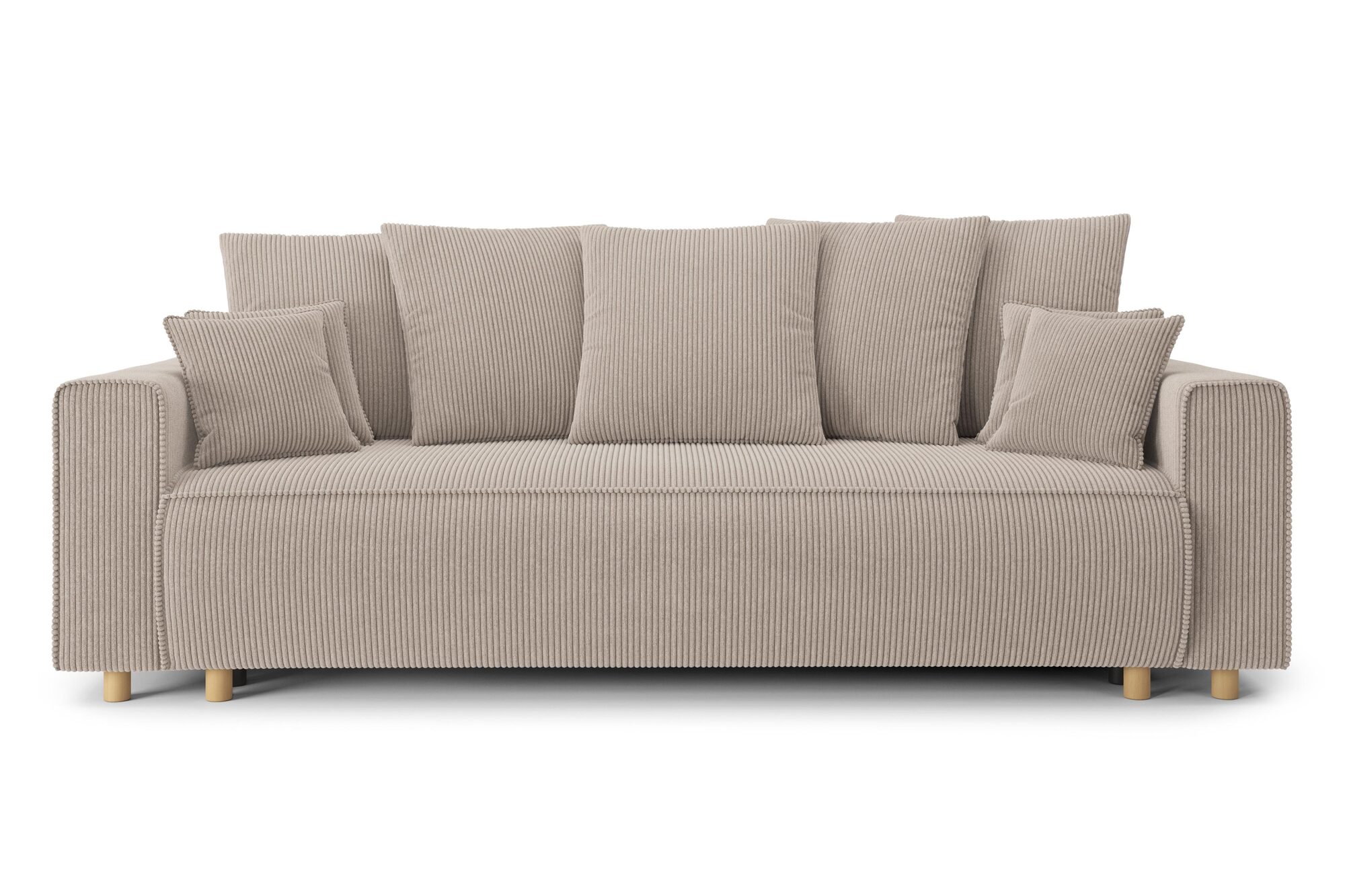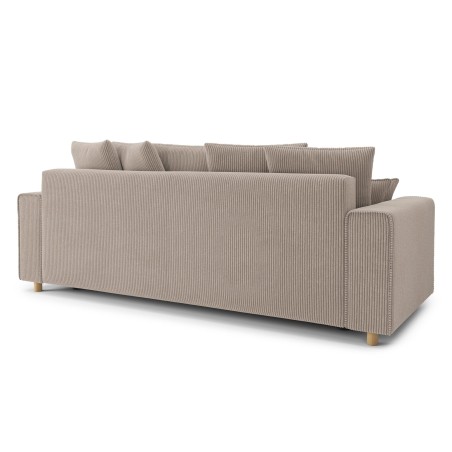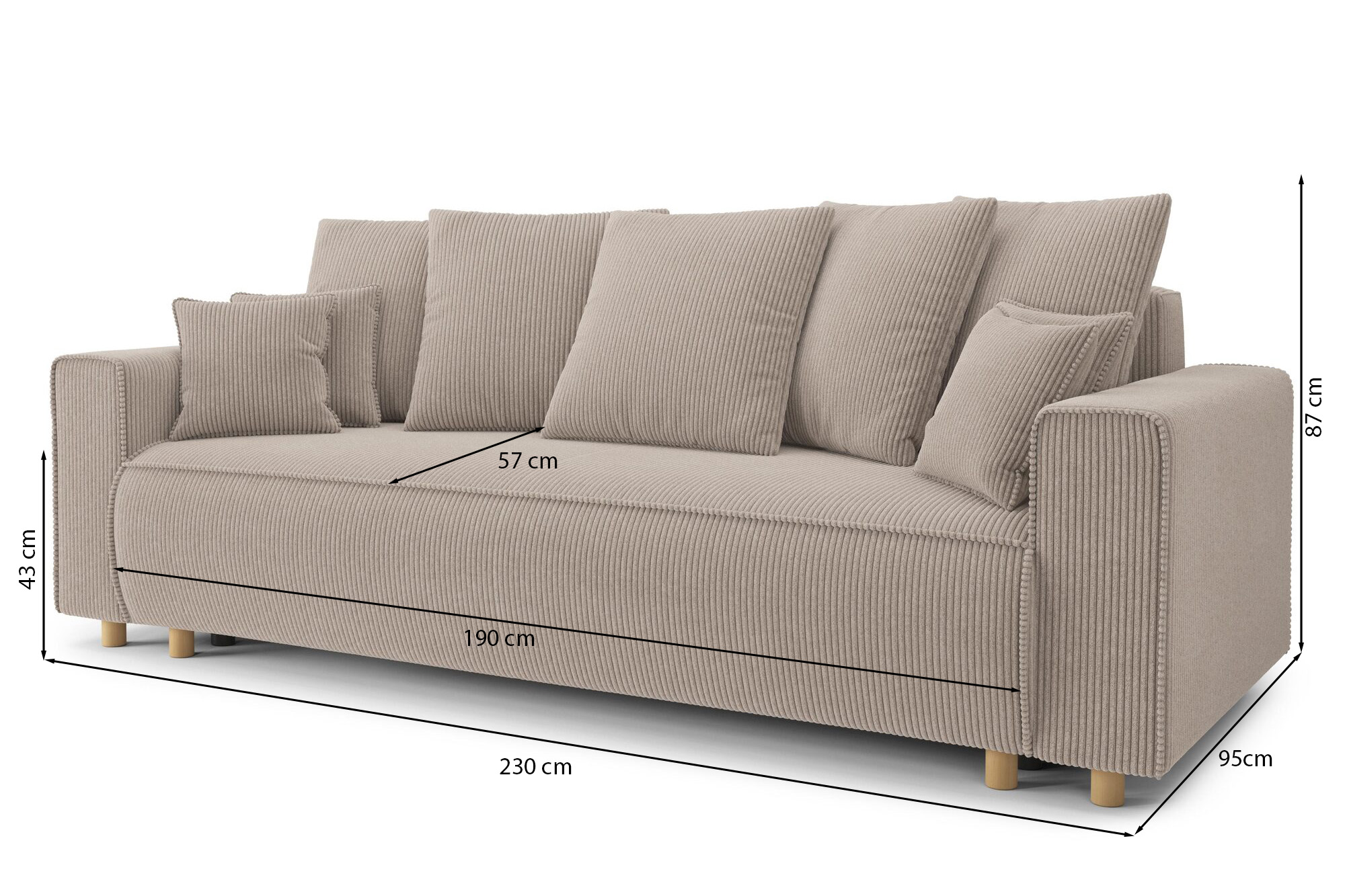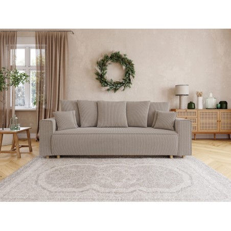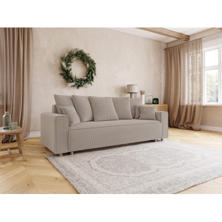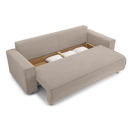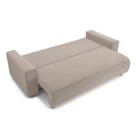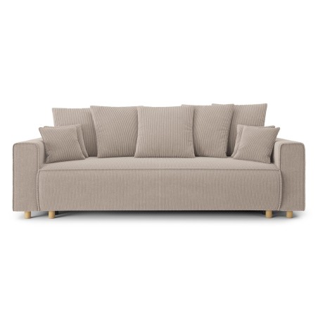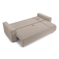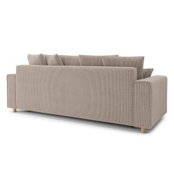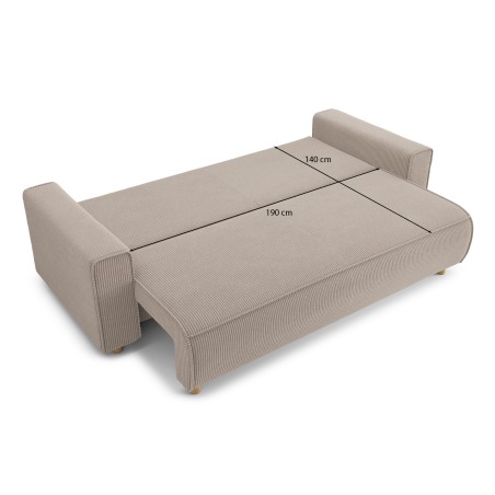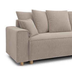 Canapé droit convertible CHARTRONS 3 places avec coffre de rangement en velours côtelé beige. Dimensions du canapé : 230 x 95 x 87 cm. Dimensions du couchage : 140 x 190 cm