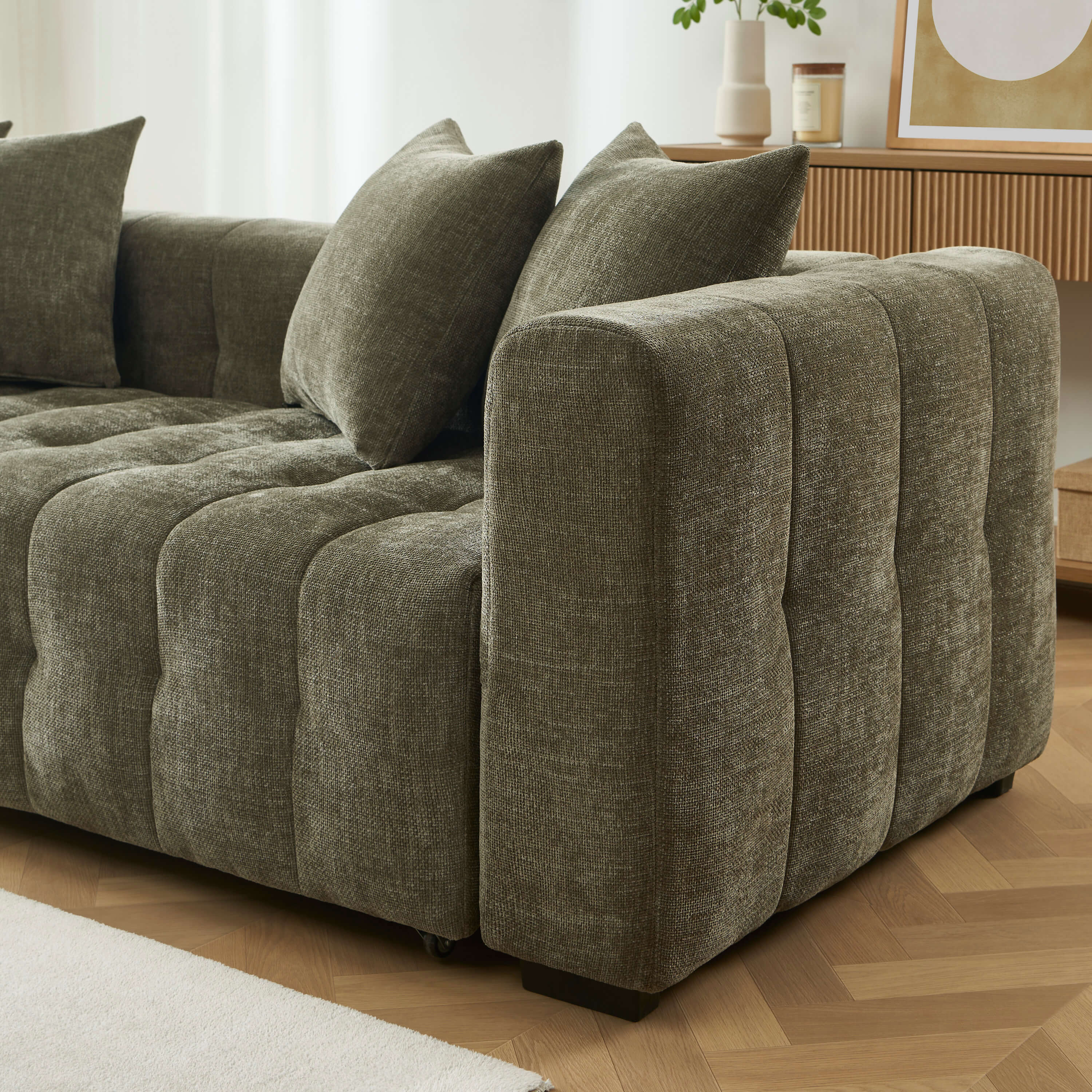 Revêtu d'un tissu agréable au toucher, il s'intègre facilement à tout type de décoration, qu'elle soit contemporaine, bohème ou scandinave. Les coussins décoratifs fournis renforcent son esprit cosy.