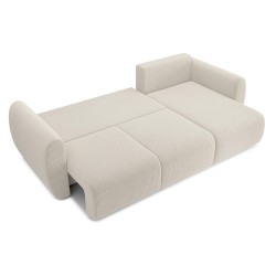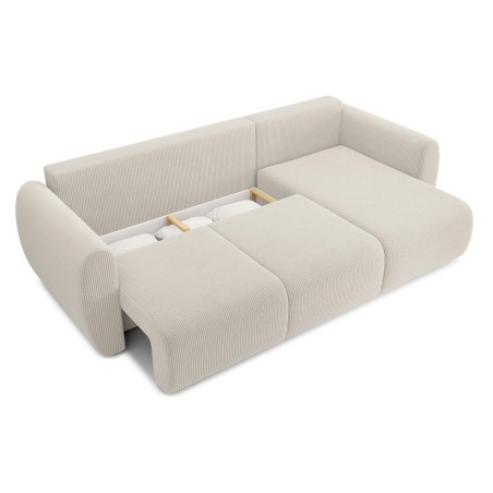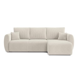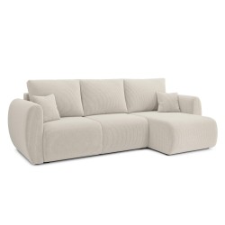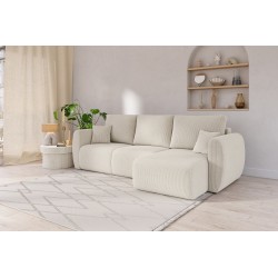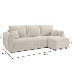 équilibréCanapé d'angle convertible REFA 4 places, avec angle reversible et coffre de rangement, en velours côtelé beige. Dimensions du canapé : 252 x 141 x 90 cm. Dimensions du couchage : 150 x 210 cm
