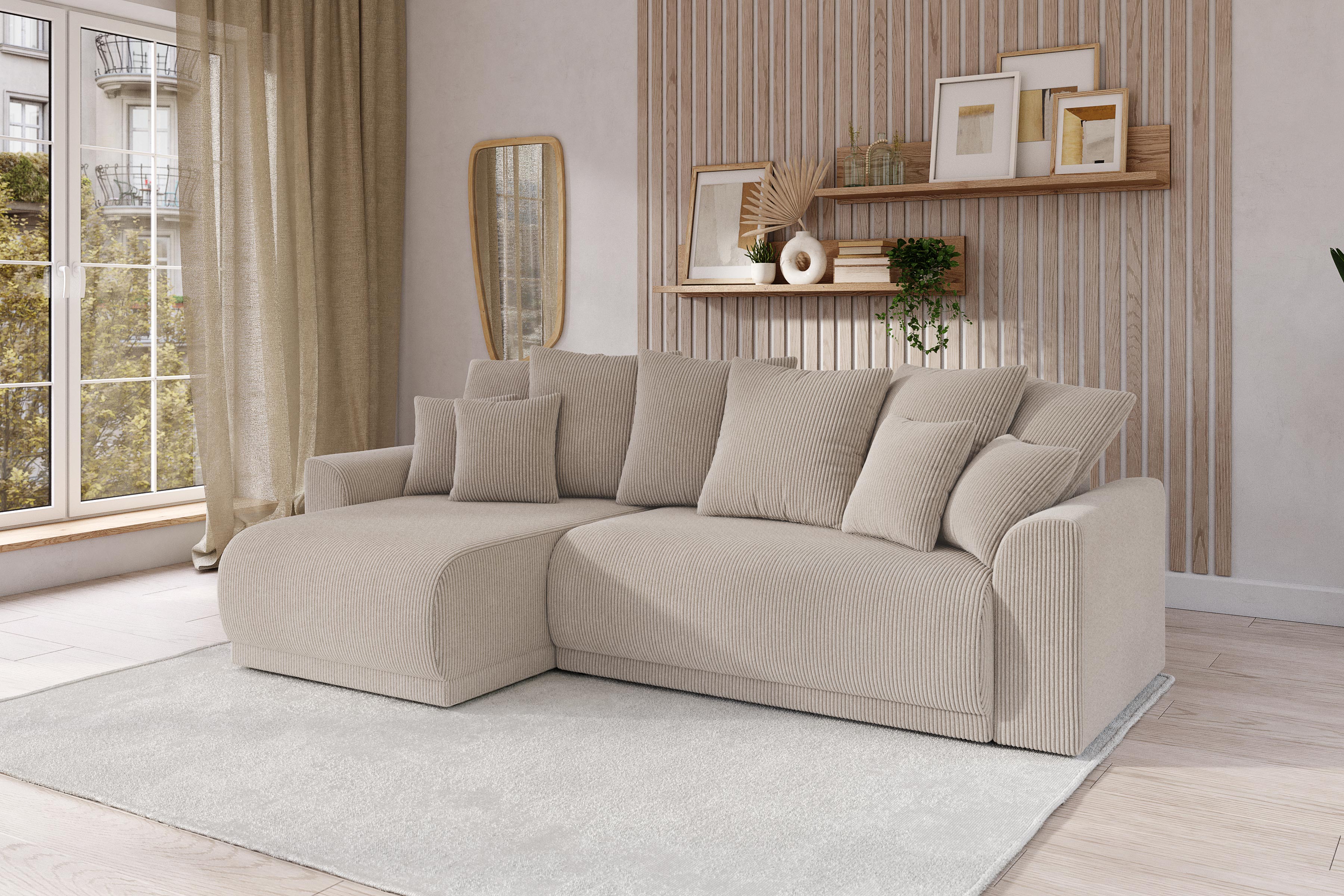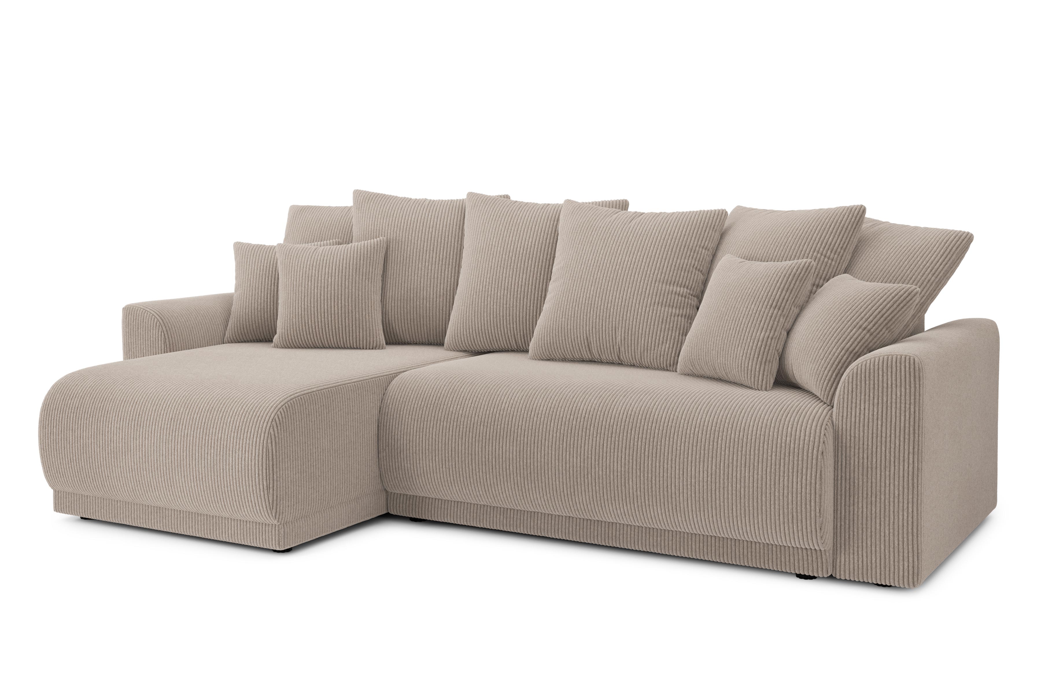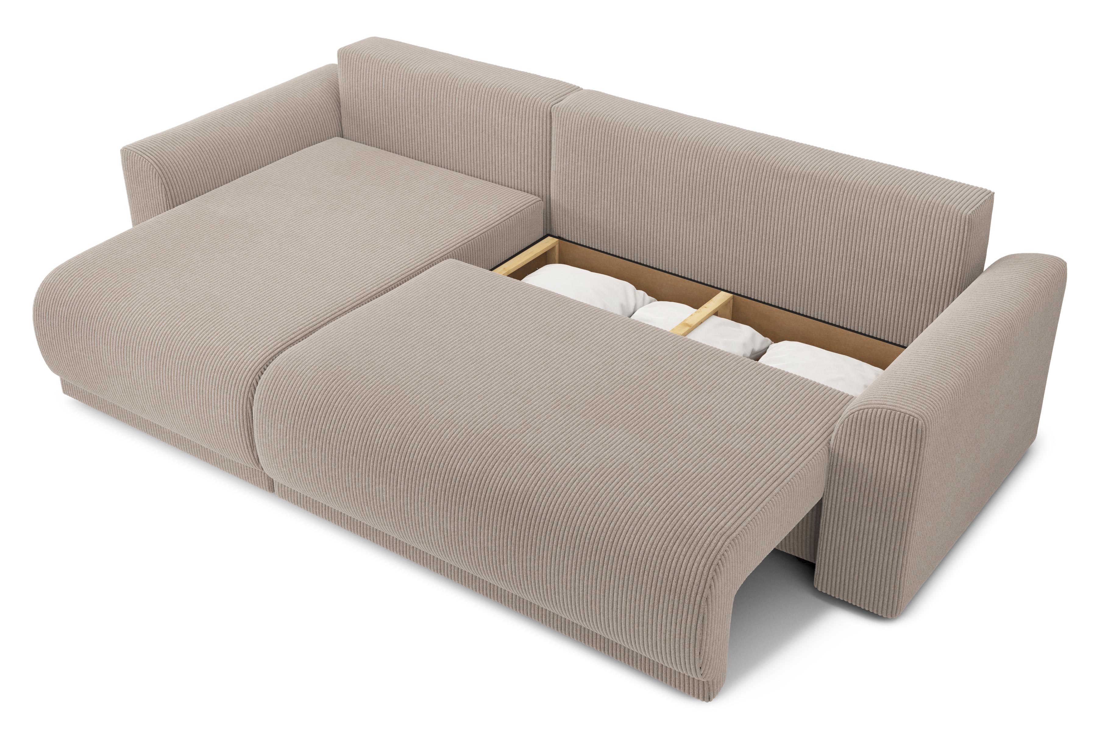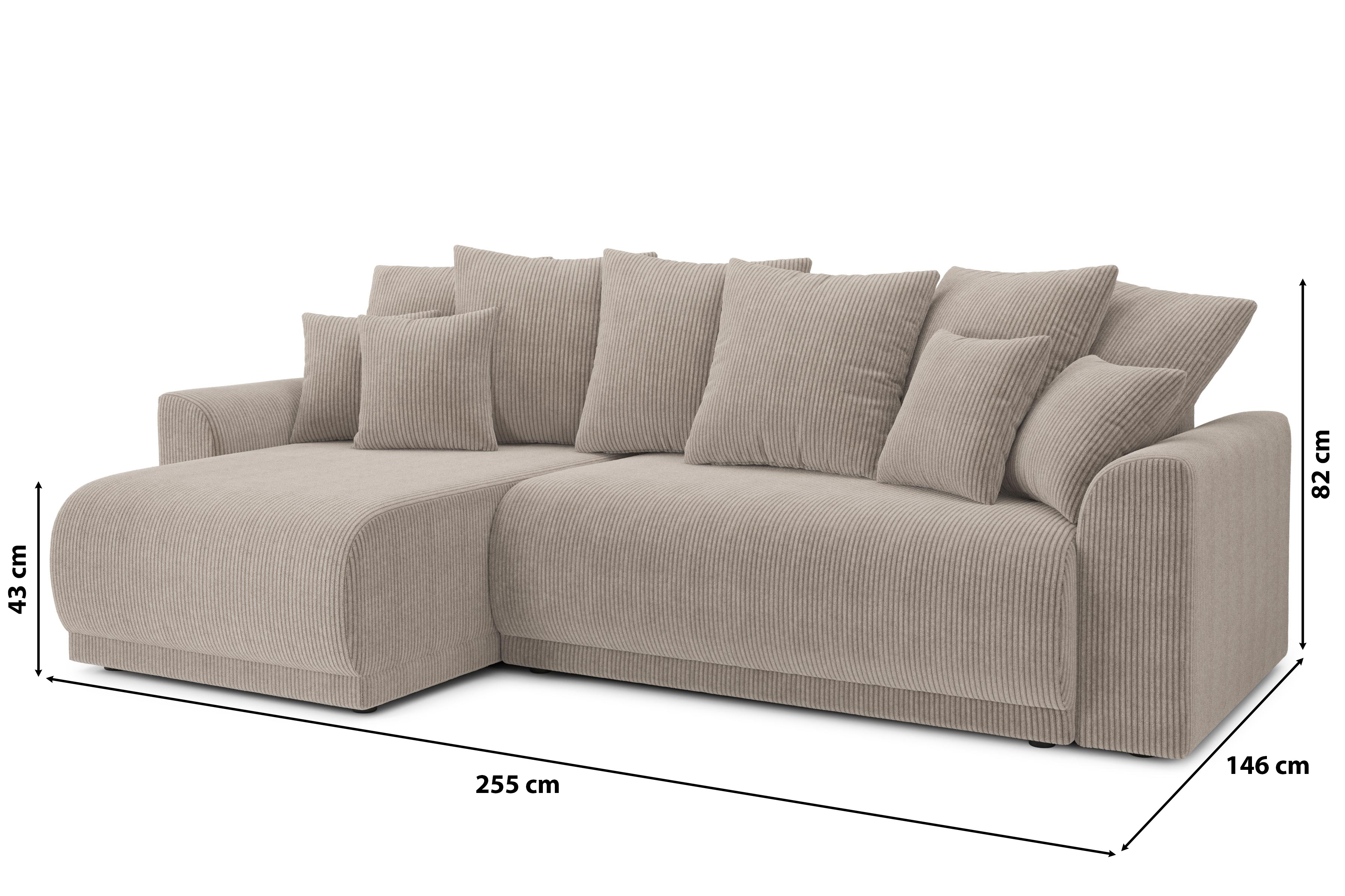 Canapé d'angle convertible NOVA 4 places, avec angle réversible et coffre de rangement, en velours côtelé grège. Dimensions du canapé : 255 x 146 x 82 cm. Dimensions du couchage : 150 x 210 cm.