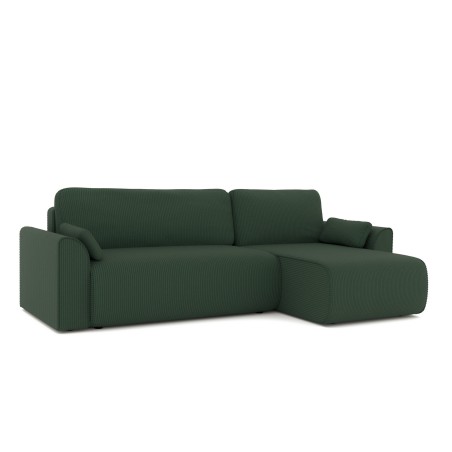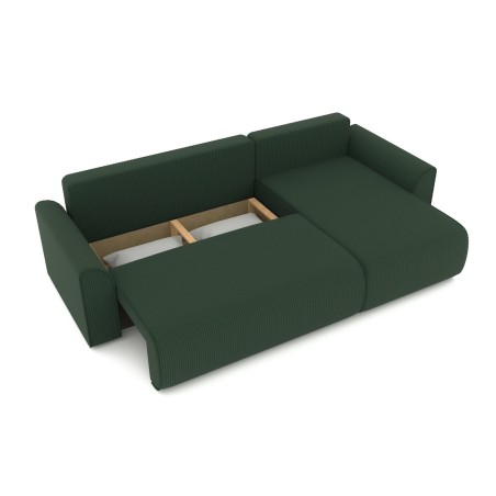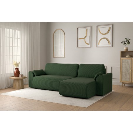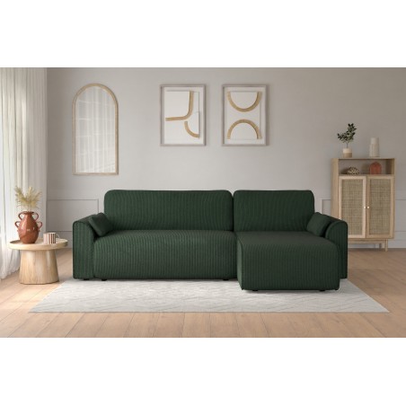 Canapé d'angle convertible CAPUCINS 4 places, avec angle réversible et coffre de rangement en velours côtelé beige. Dimensions du canapé : 255 x 146 x 82 cm. Dimensions du couchage : 150 x 210 cm