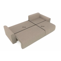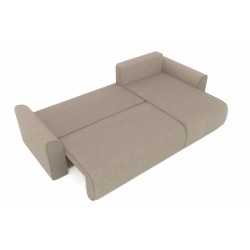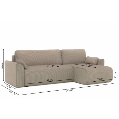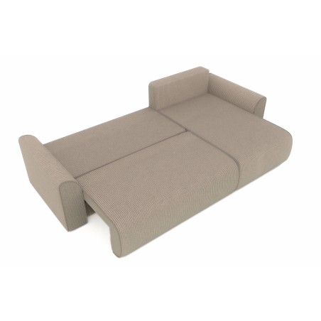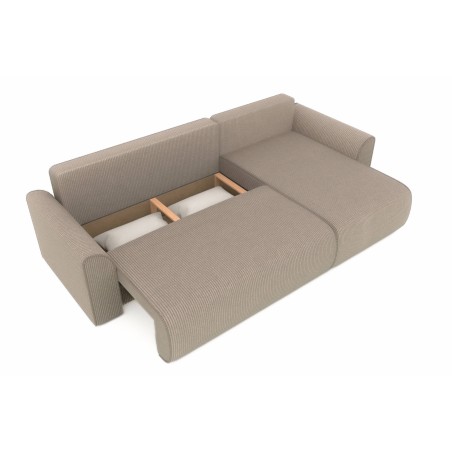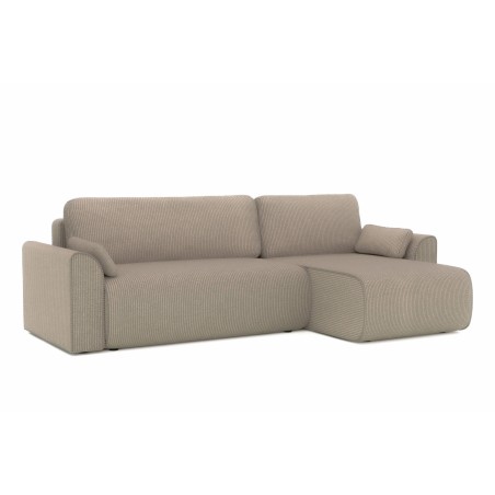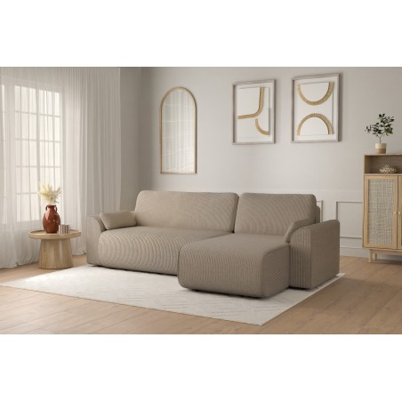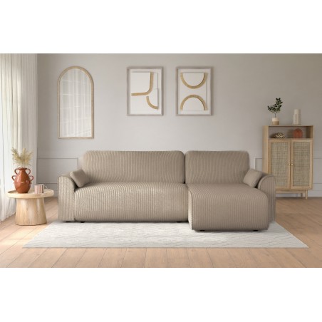 Canapé d'angle convertible CAPUCINS 4 places, avec angle réversible et coffre de rangement en velours côtelé beige. Dimensions du canapé : 255 x 146 x 82 cm. Dimensions du couchage : 150 x 210 cm