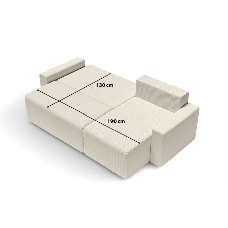 Canapé d'angle convertible MAX 4 places, avec angle réversible et coffre de rangement, en velours côtelé beige. Dimensions du canapé : 226 x 125 x 83 cm. Dimensions du couchage : 130 x 190 cm