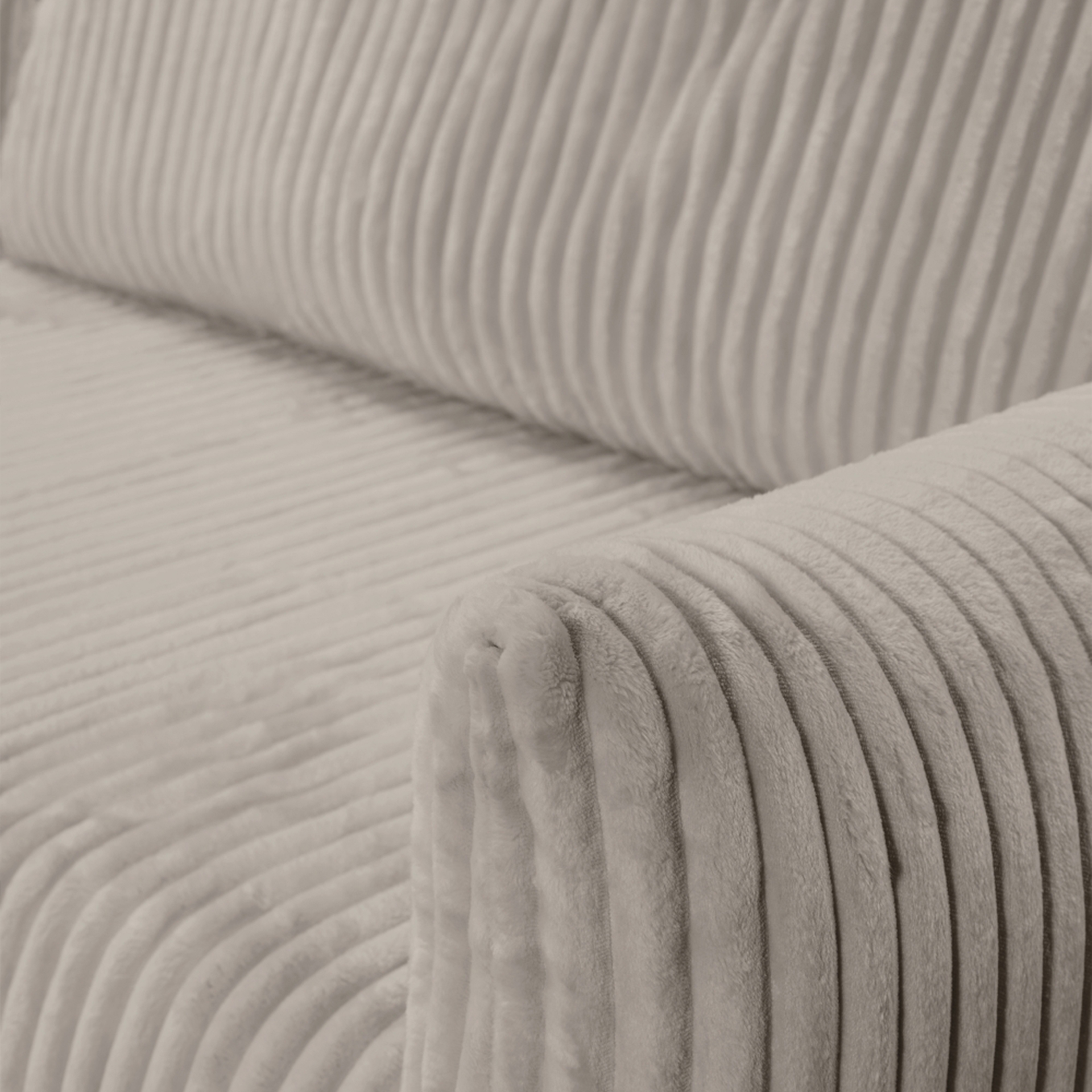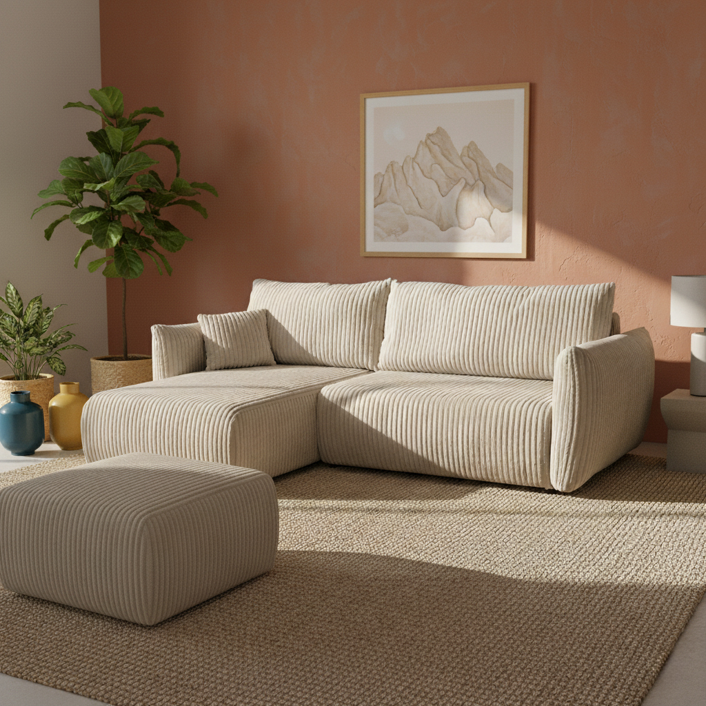Confortable et ultra pratique, le canapé d'angle GLORIA séduit par son velours côtelé tout doux, son couchage d'appoint intégré et son coffre de rangement discret.