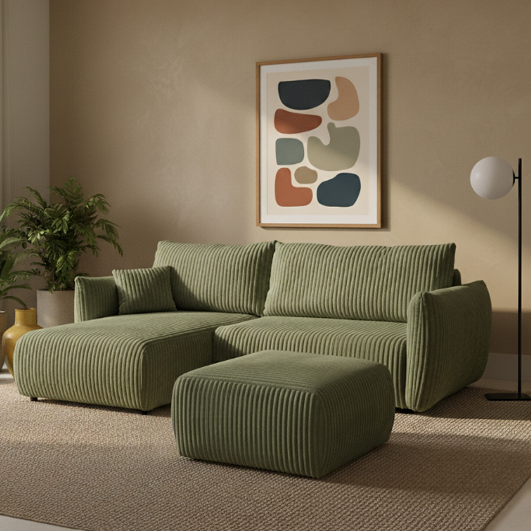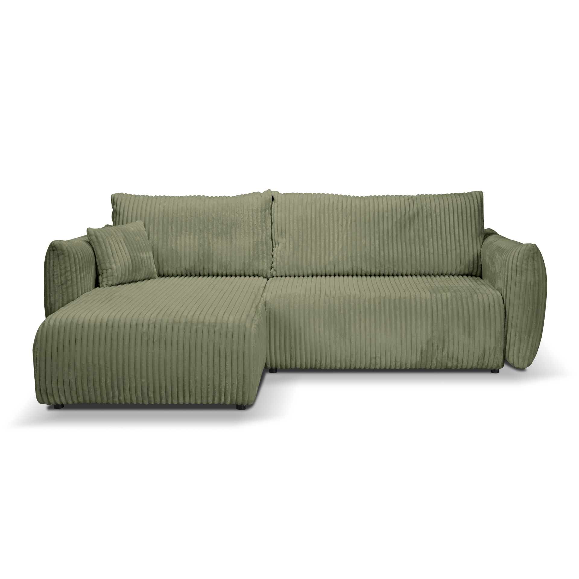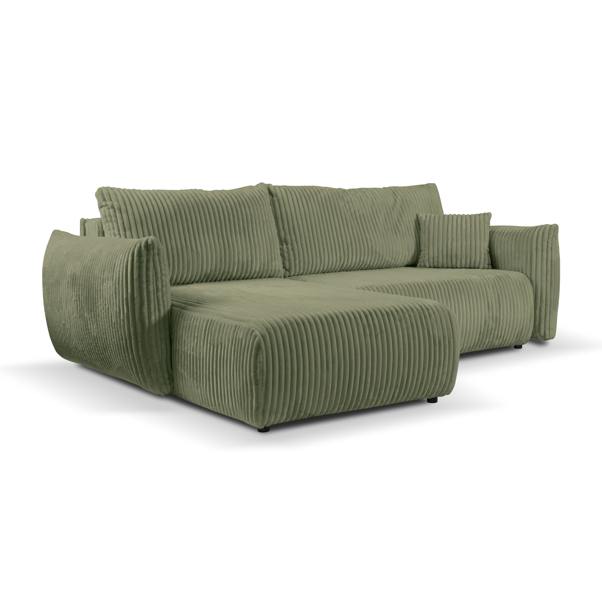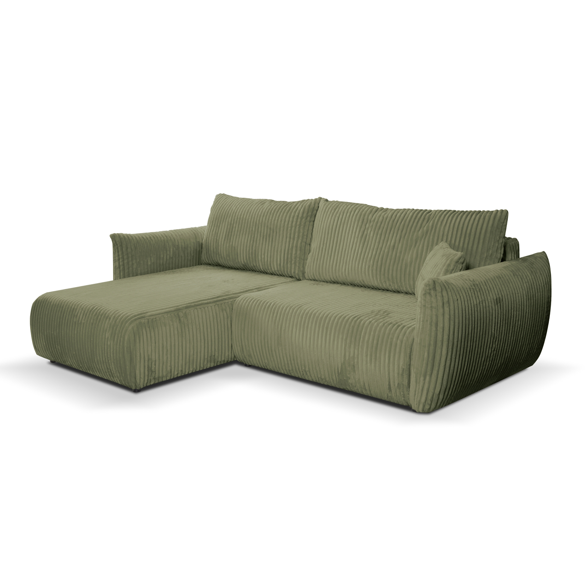 Confortable et ultra pratique, le canapé d'angle GLORIA séduit par son velours côtelé tout doux, son couchage d'appoint intégré et son coffre de rangement discret.