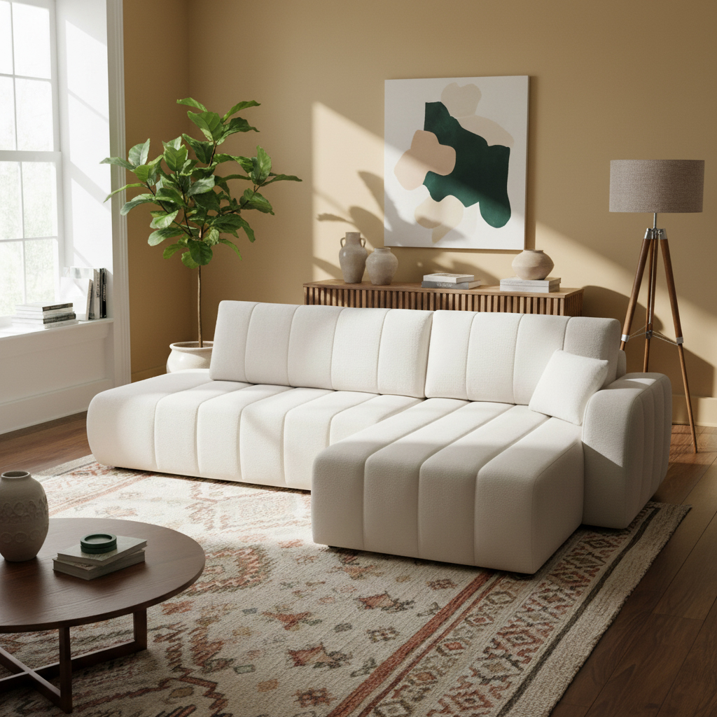 Craquez pour le canapé d'angle BELEM : le parfait mélange entre confort et praticité. Habillé d'un tissu bouclette tout doux, il est parfait pour rendre votre salon cosy tout en simplifiant votre quotidien.