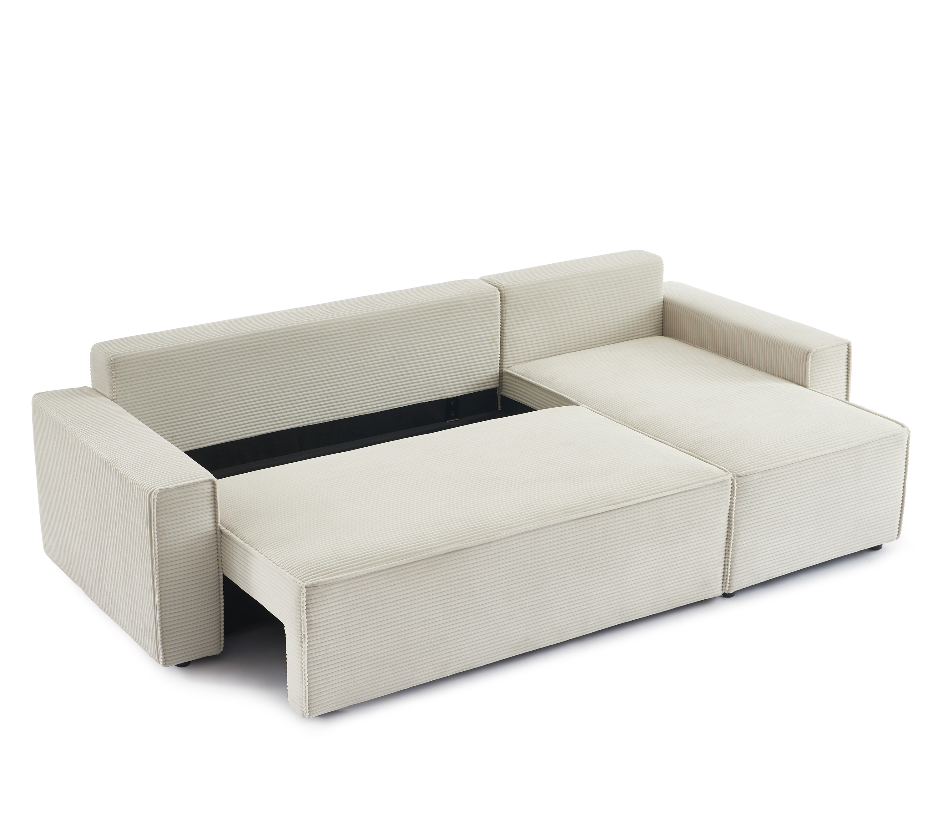 Le canapé ZOLA s'adapte à vos besoins et à votre espace. Son angle réversible vous permet de positionner la méridienne à gauche ou à droite, selon vos envies. De plus, sa fonction convertible permet de le transformer rapidement en un couchage d'appoint de 140 x 210 cm, parfait pour accueillir famille et amis en toute simplicité. Sous l'assise, vous trouverez un coffre de rangement, idéal pour y stocker vos coussins et plaids.