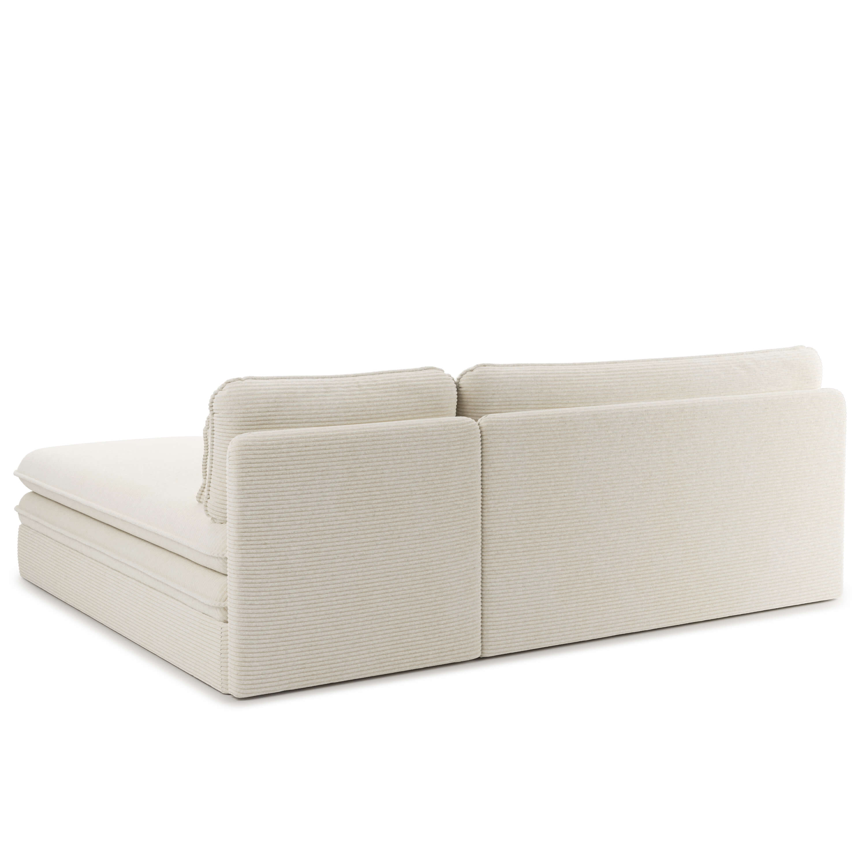Reposant sur une structure en bois et MDF, la banquette garantit stabilité et durabilité. Son assise généreuse et sa méridienne spacieuse invitent à la détente, que ce soit pour se reposer, lire ou partager un moment convivial.