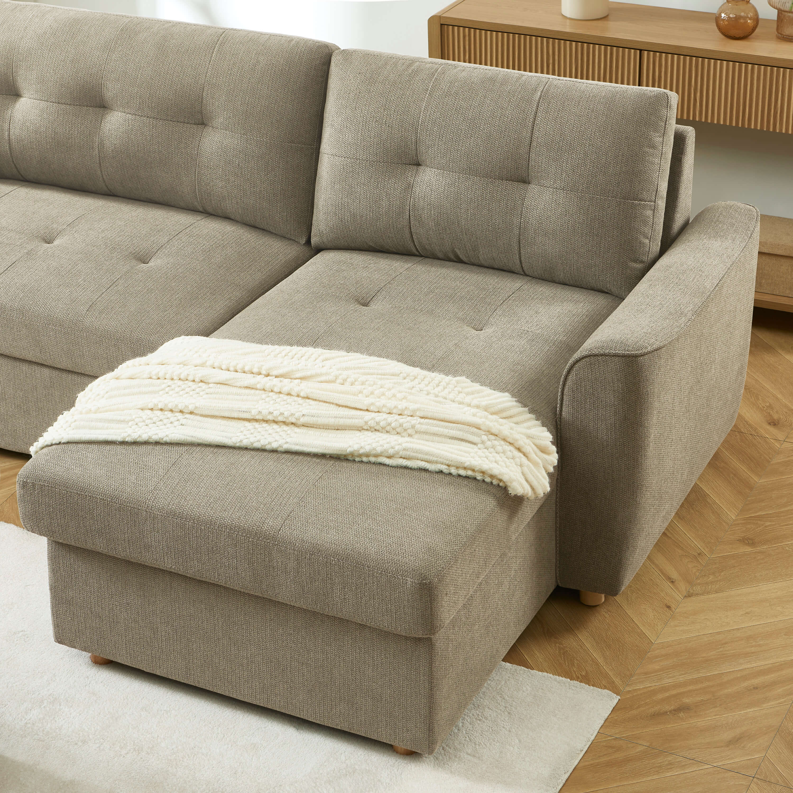 équilibréLe canapé d'angle TAMARA combine style et praticité : un 4 places convertible et réversible, pensé pour offrir un espace convivial le jour et un couchage confortable la nuit.