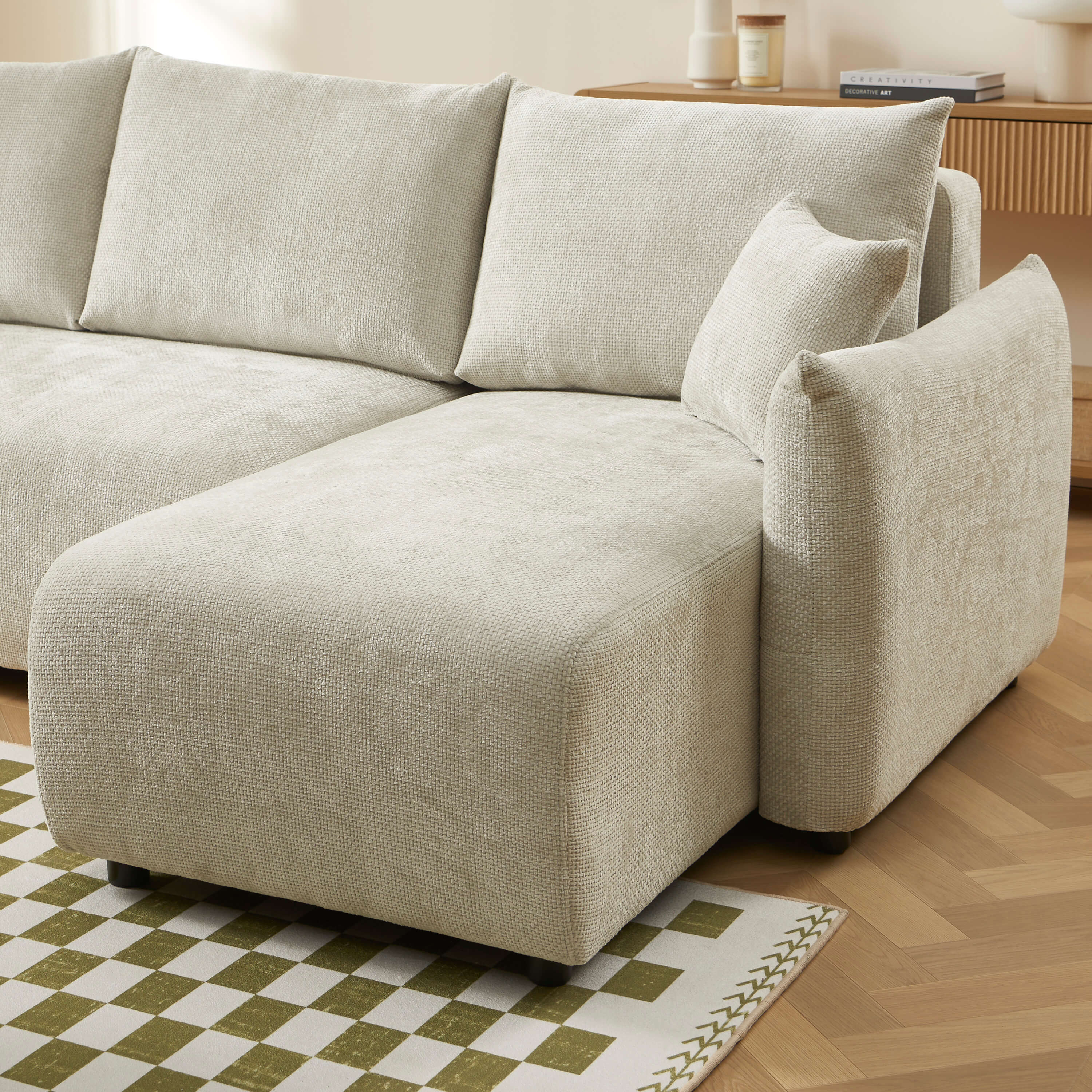 Canapé d'angle convertible et réversible NEMEA 4 places tissu chenille beige