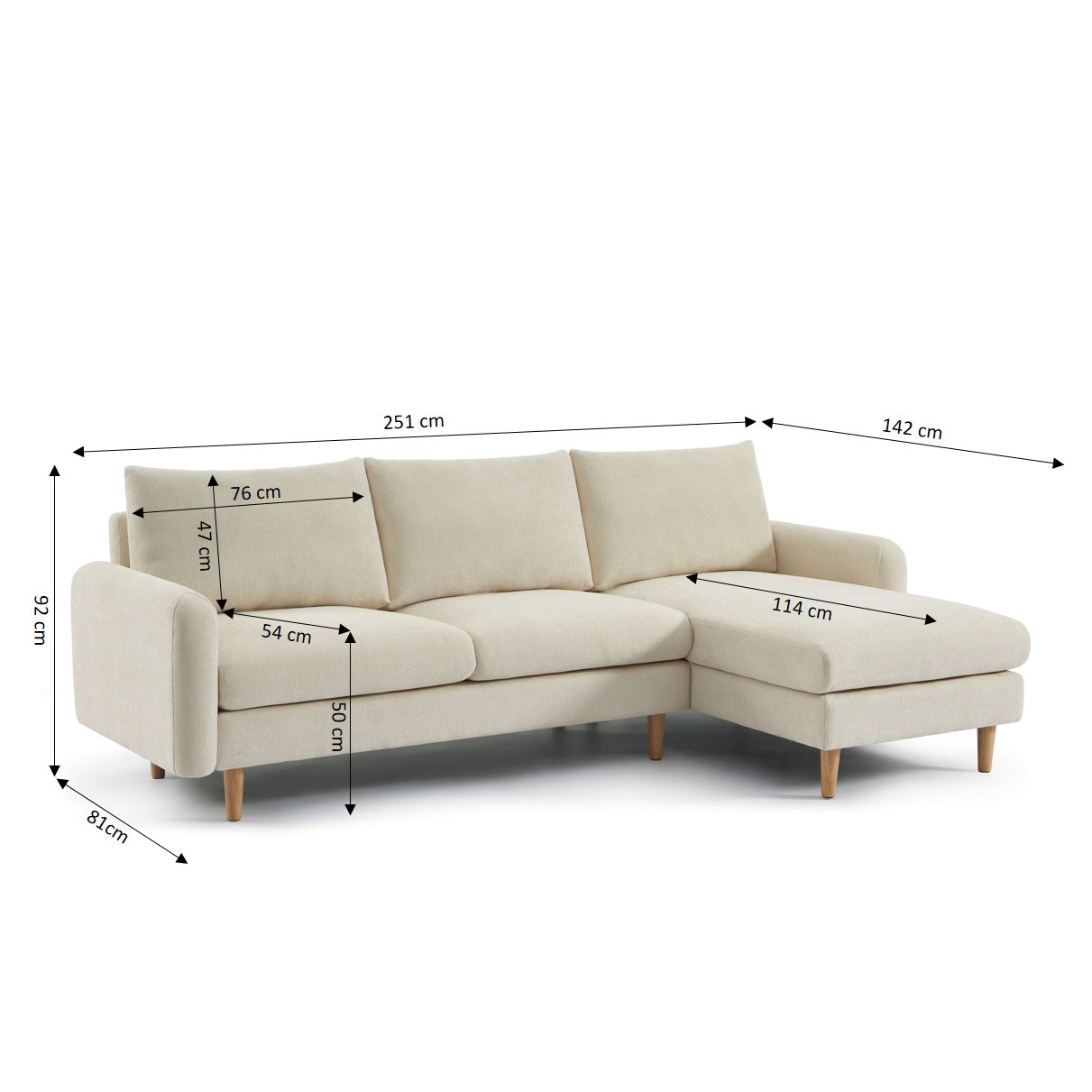 Avec son style scandinave intemporel, le canapé d'angle réversible s'adapte facilement à tous types de décoration et de configuration de pièces. Avec ses dimensions L251 x P142 x H92 cm et sa hauteur d'assise de 50 cm, il offre un espace généreux tout en restant pratique et fonctionnel.