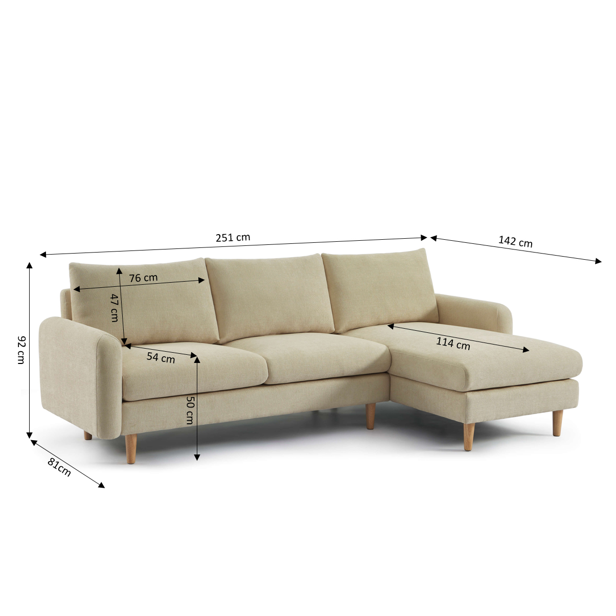 Avec son style scandinave intemporel, le canapé d'angle réversible s'adapte facilement à tous types de décoration et de configuration de pièces. Avec ses dimensions L251 x P142 x H92 cm et sa hauteur d'assise de 50 cm, il offre un espace généreux tout en restant pratique et fonctionnel.