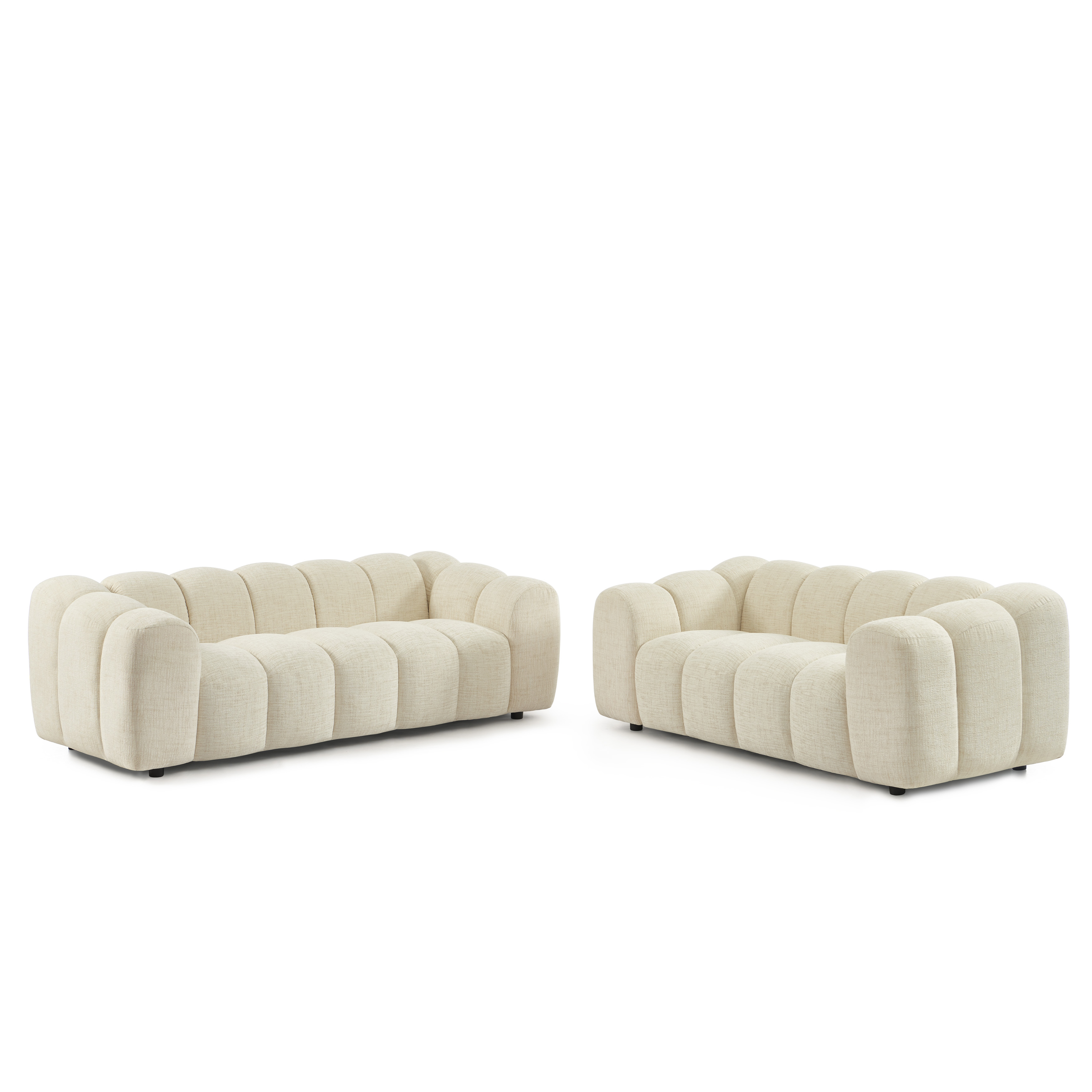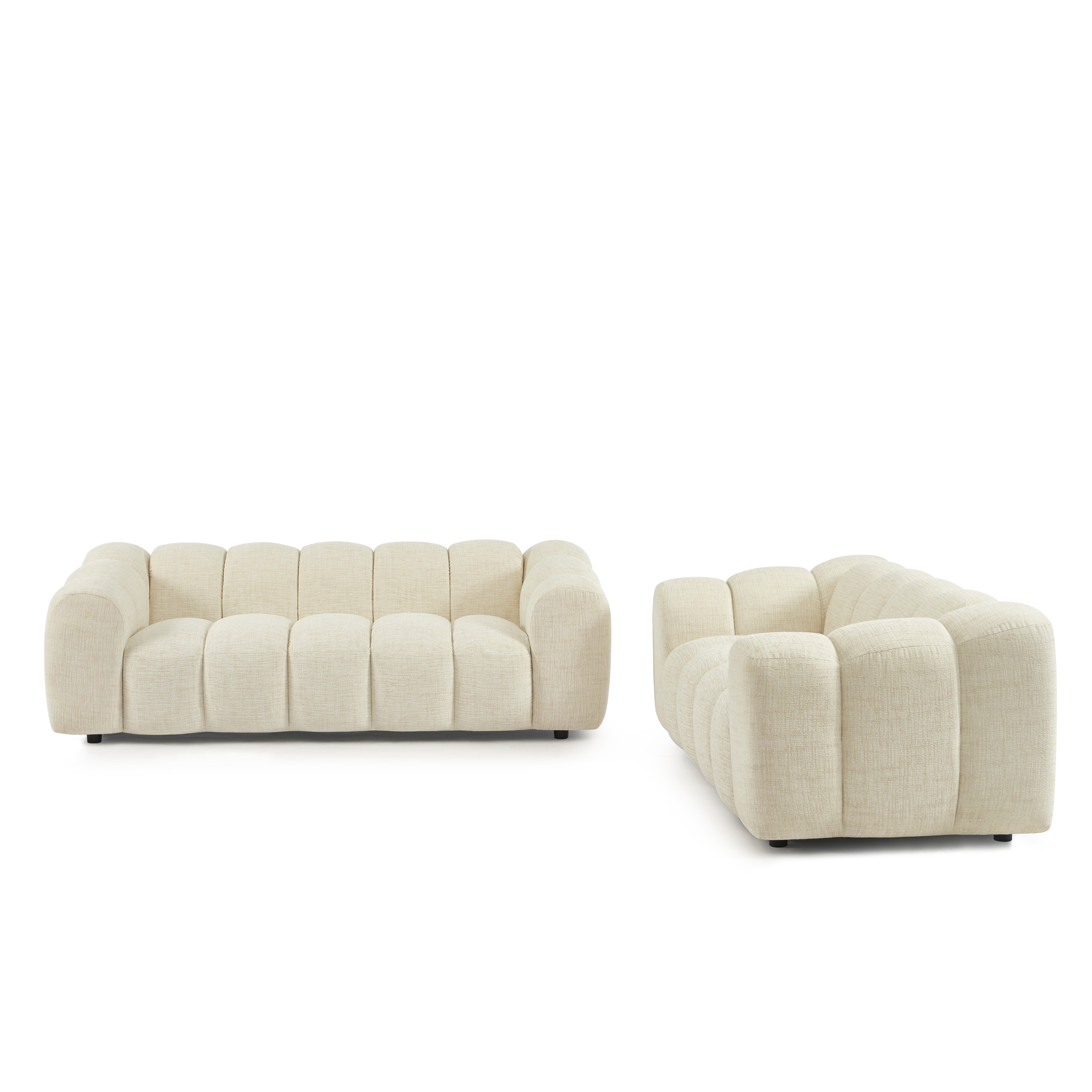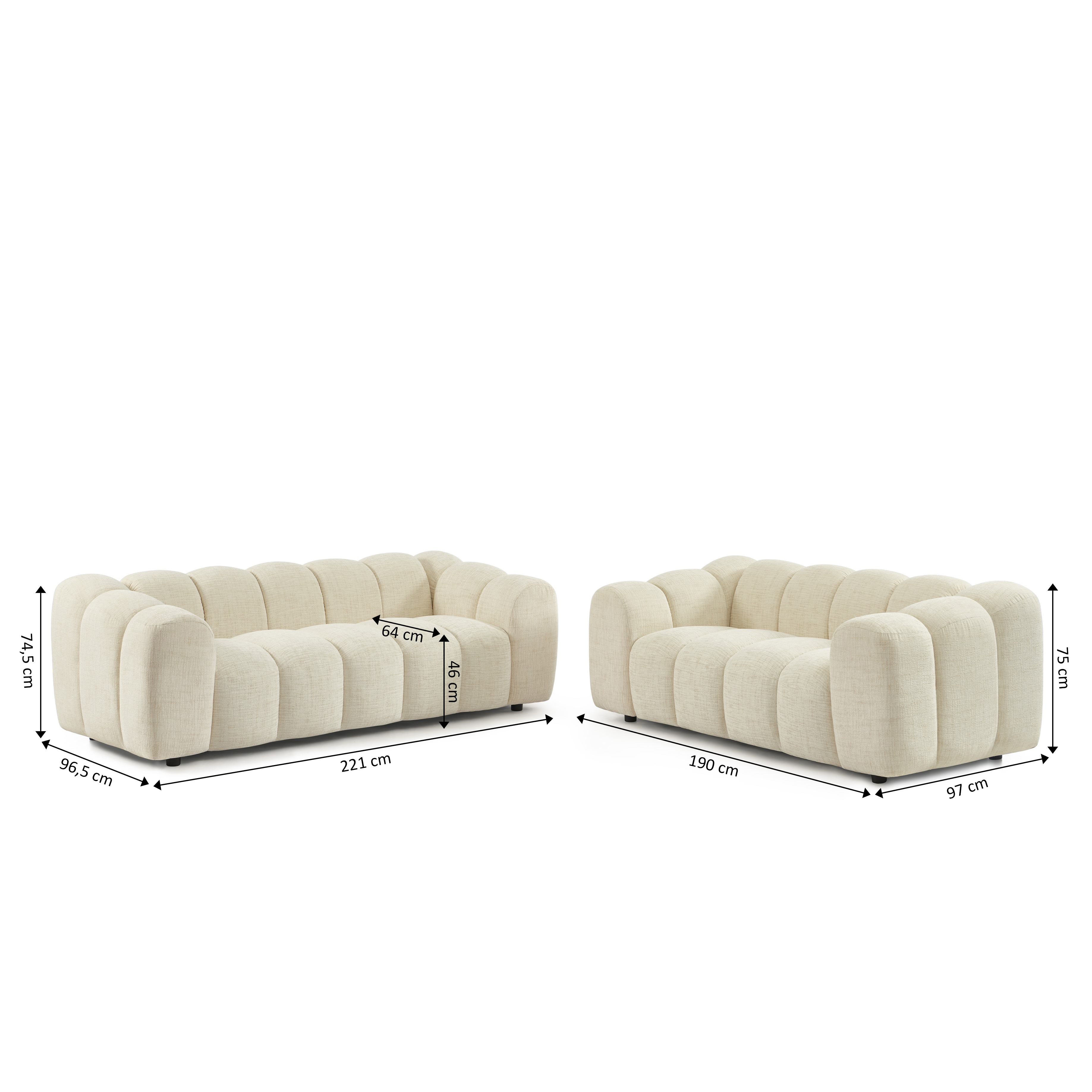 Combinant un canapé 2 places et un canapé 3 places, l’ensemble SUNNY séduit par ses lignes arrondies et son revêtement en tweed. Son design chaleureux et intemporel crée une atmosphère conviviale, idéale pour habiller un salon moderne comme plus classique.