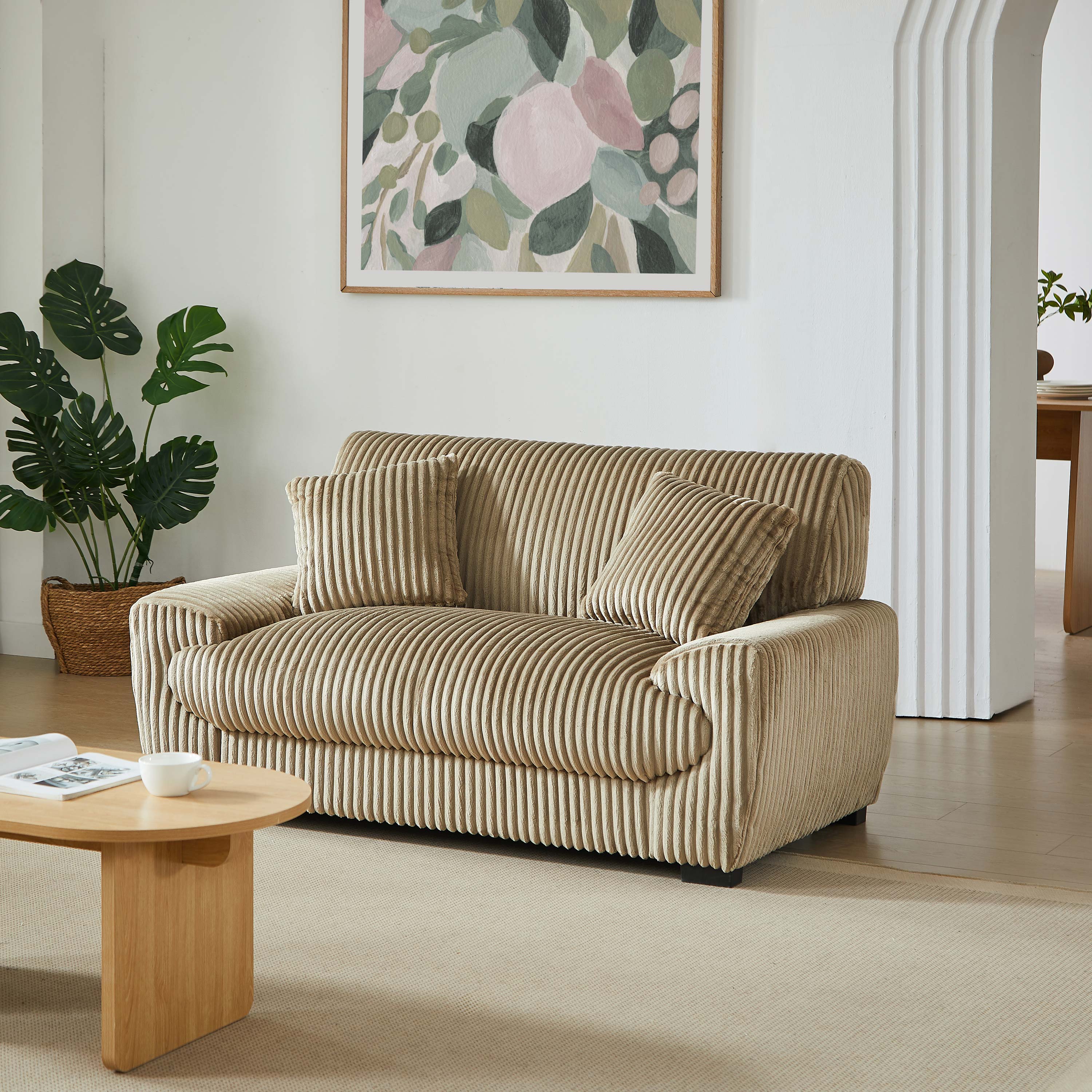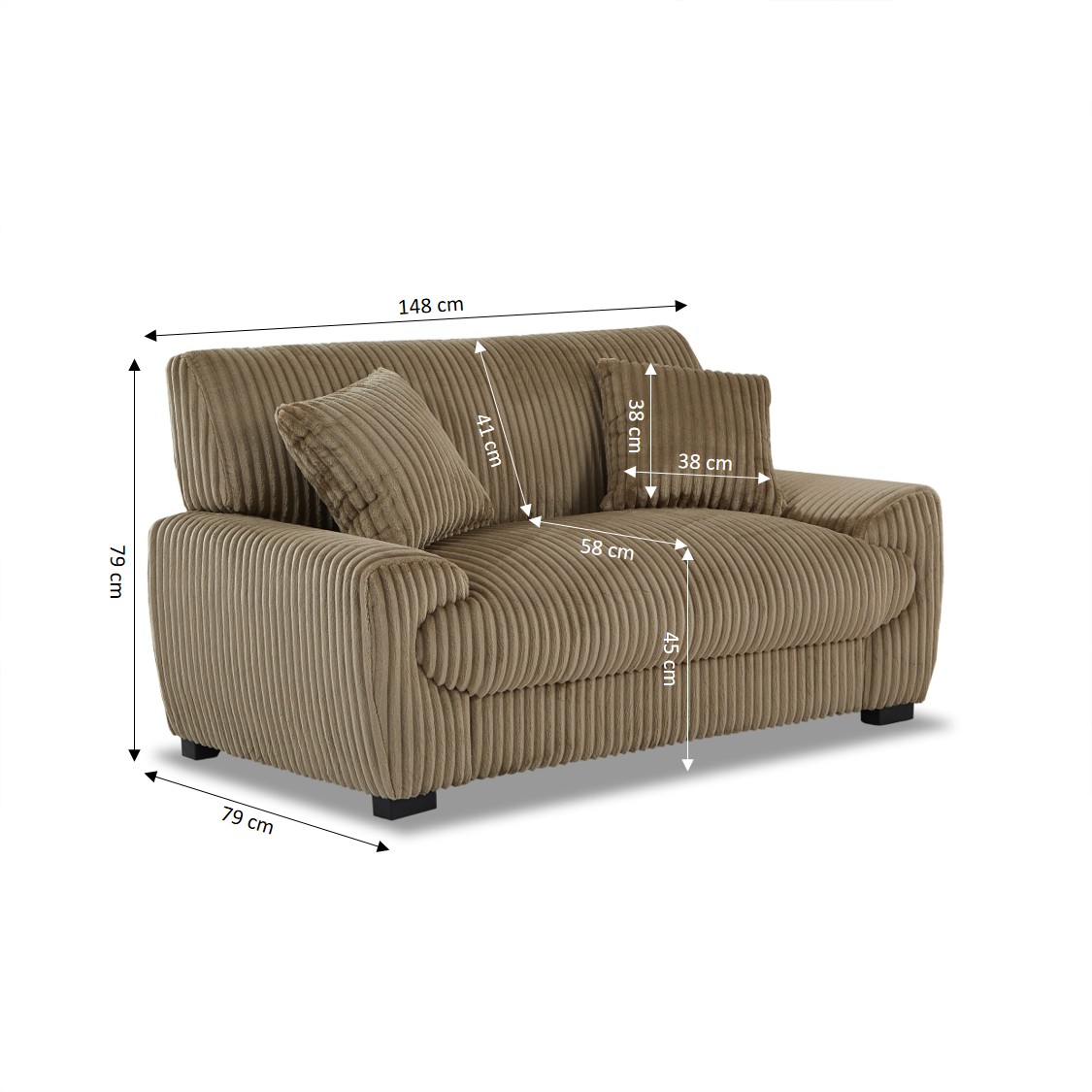 Habillé d’un velours côtelé doux au toucher, ce canapé allie style et confort. Les pieds noirs discrets soulignent son look contemporain, tandis que les deux coussins décoratifs inclus renforcent son aspect cosy et tendance. Le canapé ADEA est facile à monter et s’adapte aisément à différents styles de décoration, du plus moderne au plus chaleureux.