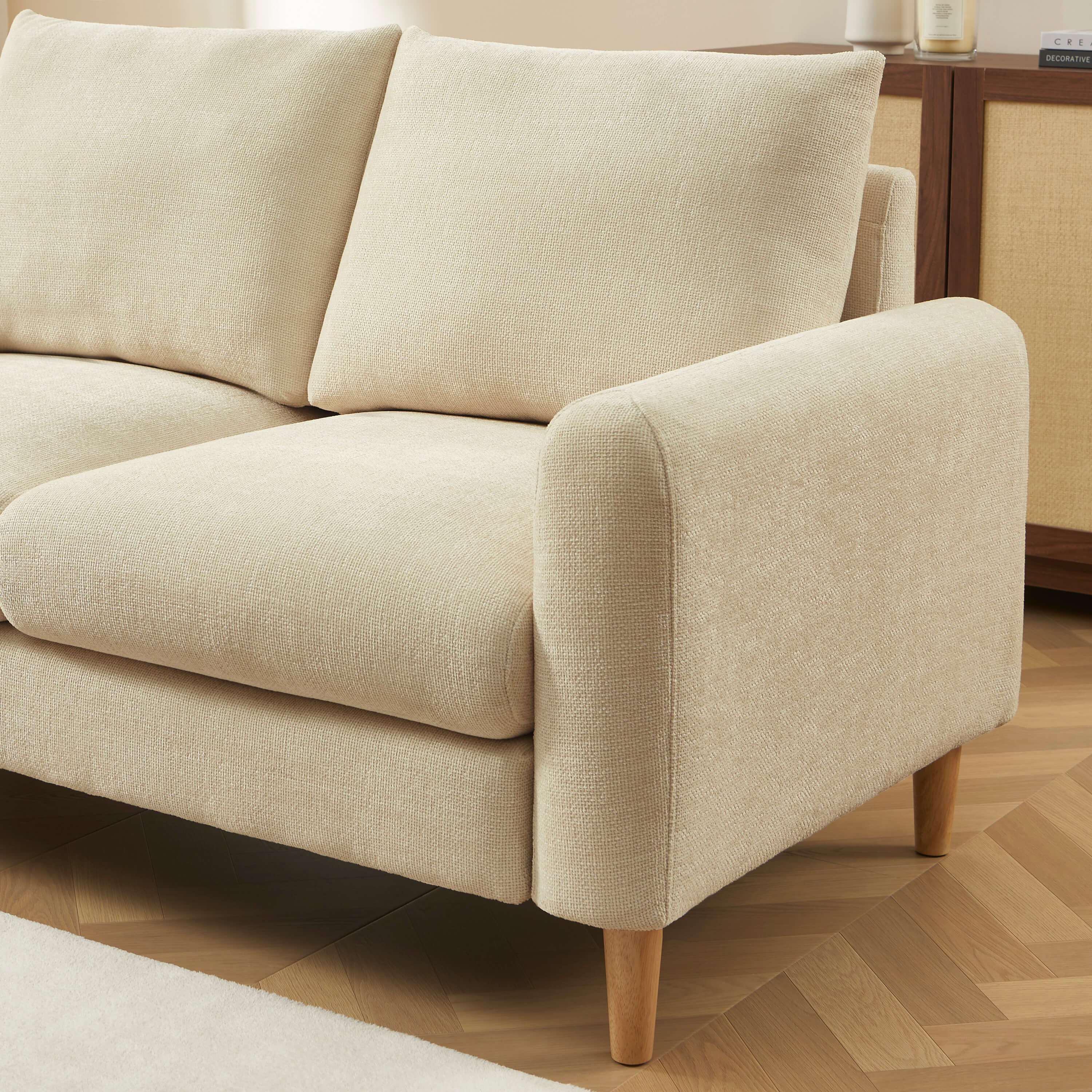 Habillé d'un tissu chenille au toucher doux, le canapé CALIBA invite à la détente. Son assise de densité 25 kg/m³, associée à une profondeur de 54 cm et une largeur d'assise de 120 cm, offre un confort équilibré, idéal pour les moments de repos. Son format compact en fait une solution parfaitement adaptée aux espaces restreints, sans compromis sur le confort.