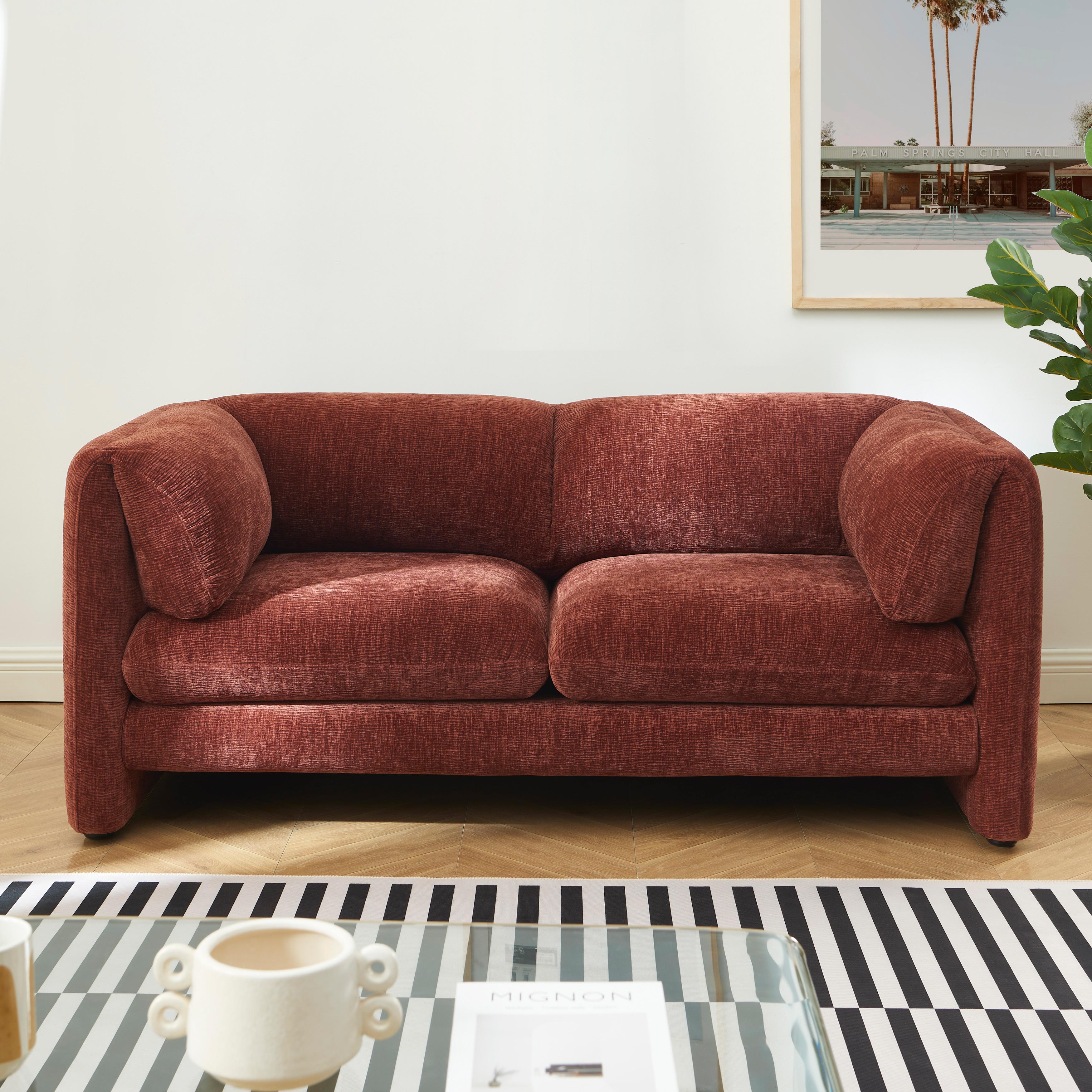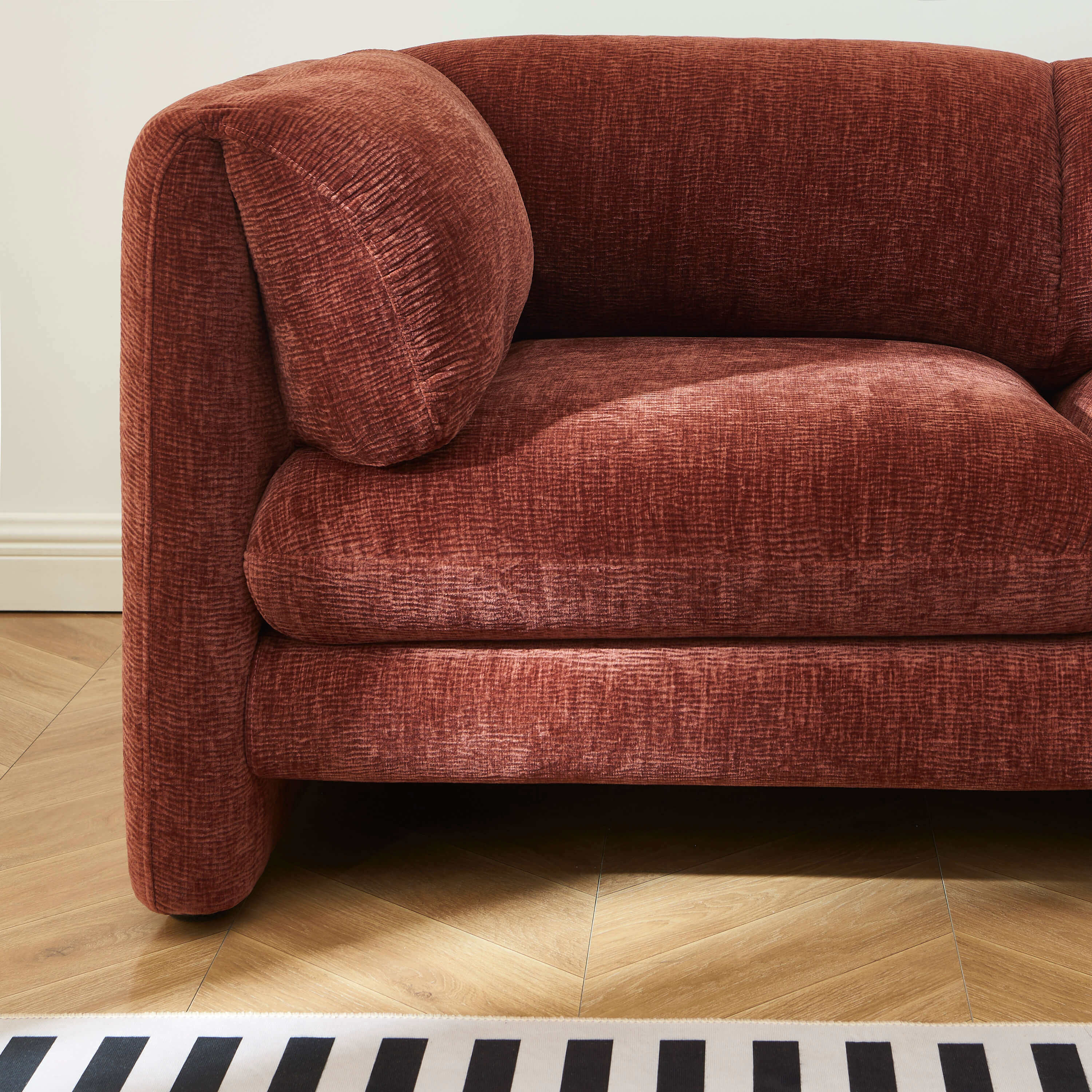 Le canapé droit fixe NIKKI se distingue par ses lignes arrondies et son allure moderne. Son revêtement en velours texturé 100% polyester offre un toucher agréable au quotidien. Son format compact le rend parfaitement adapté aux petits espaces comme aux salons plus spacieux.