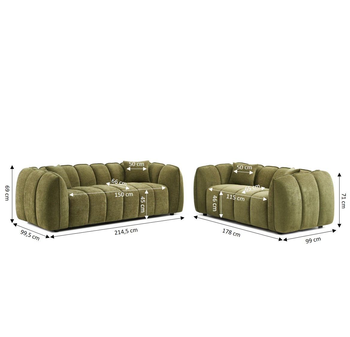 Grâce à son gabarit généreux sans être encombrant, l'ensemble MATILDA trouve sa place aussi bien dans un grand salon que dans un espace plus compact. Ses coussins moelleux et ses assises larges en font un choix sûr pour ceux qui recherchent confort et style dans un ensemble harmonieux.