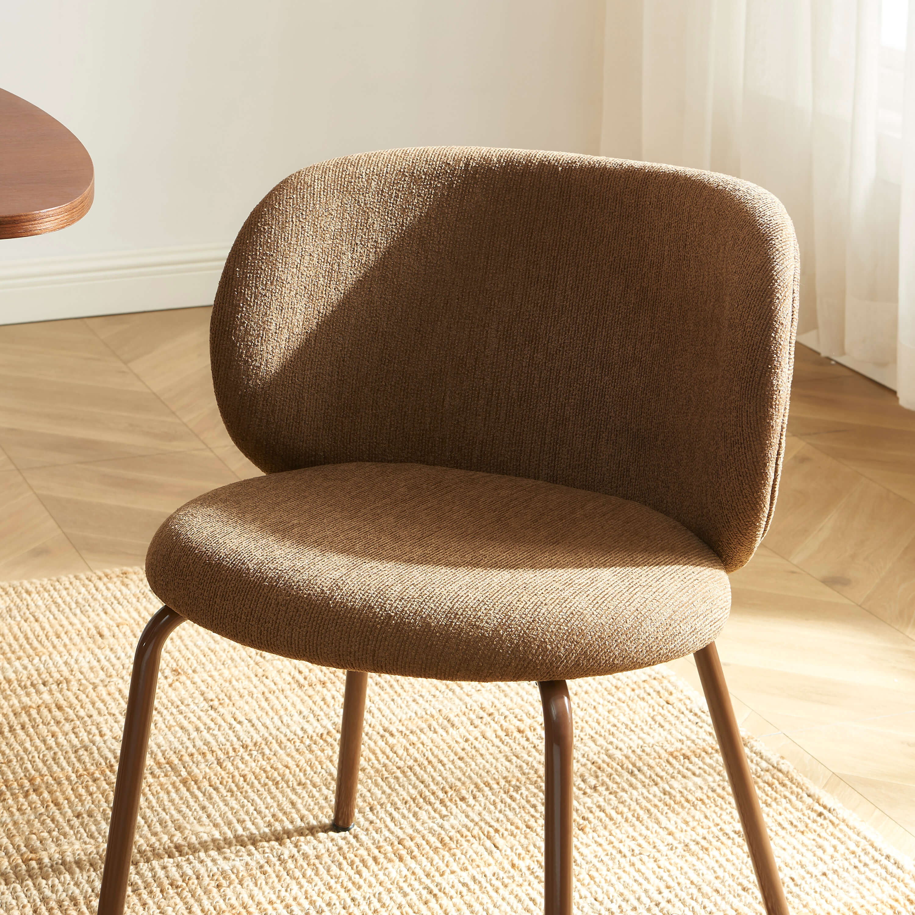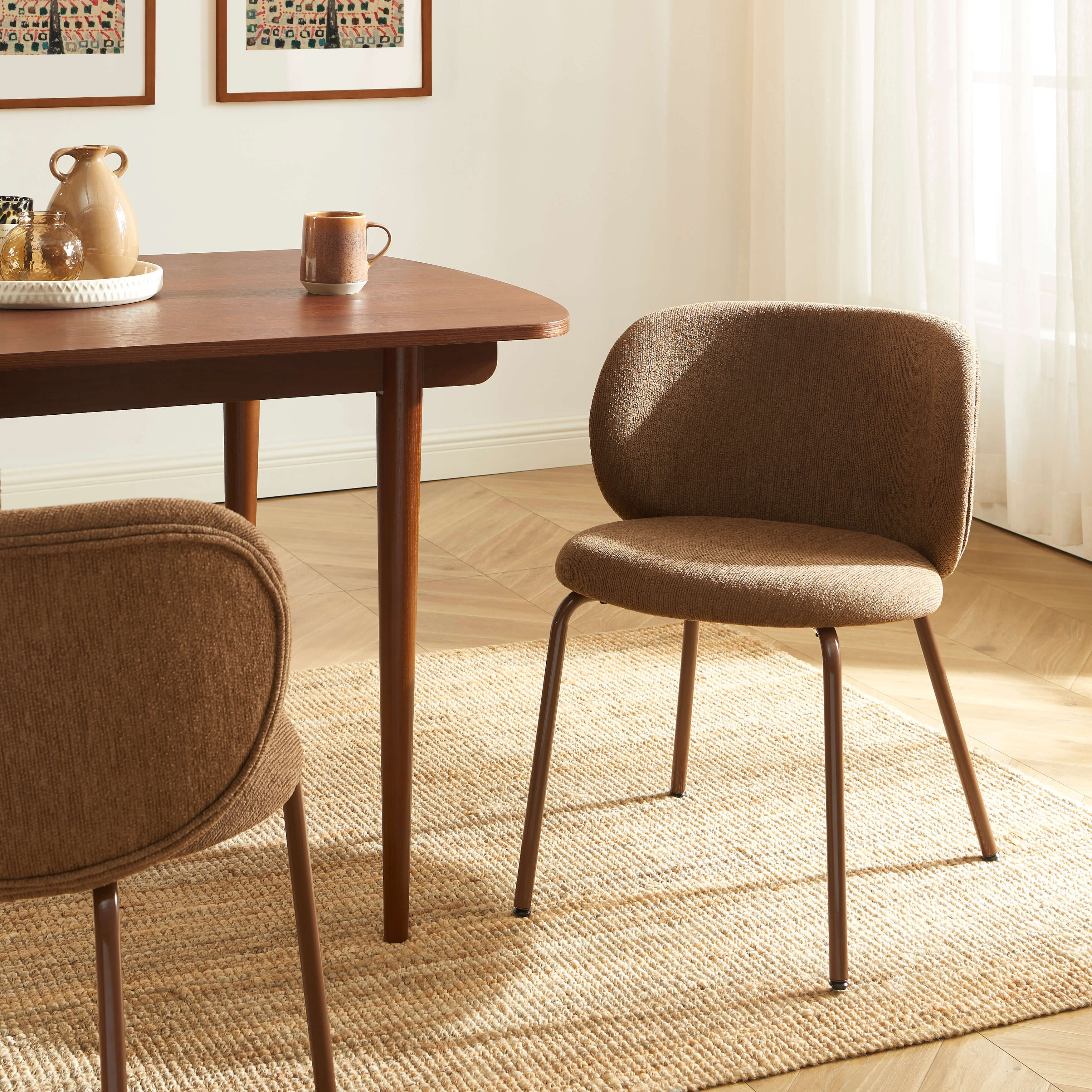 Alliez élégance et confort avec le lot de 2 chaises SERENA en tissu chenille et pieds métal marron : un design raffiné pour sublimer votre espace repas.