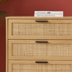 Découvrez la commode AMANA, un meuble élégant et fonctionnel en cannage et effet bois pour votre chambre, salon ou espace de travail.