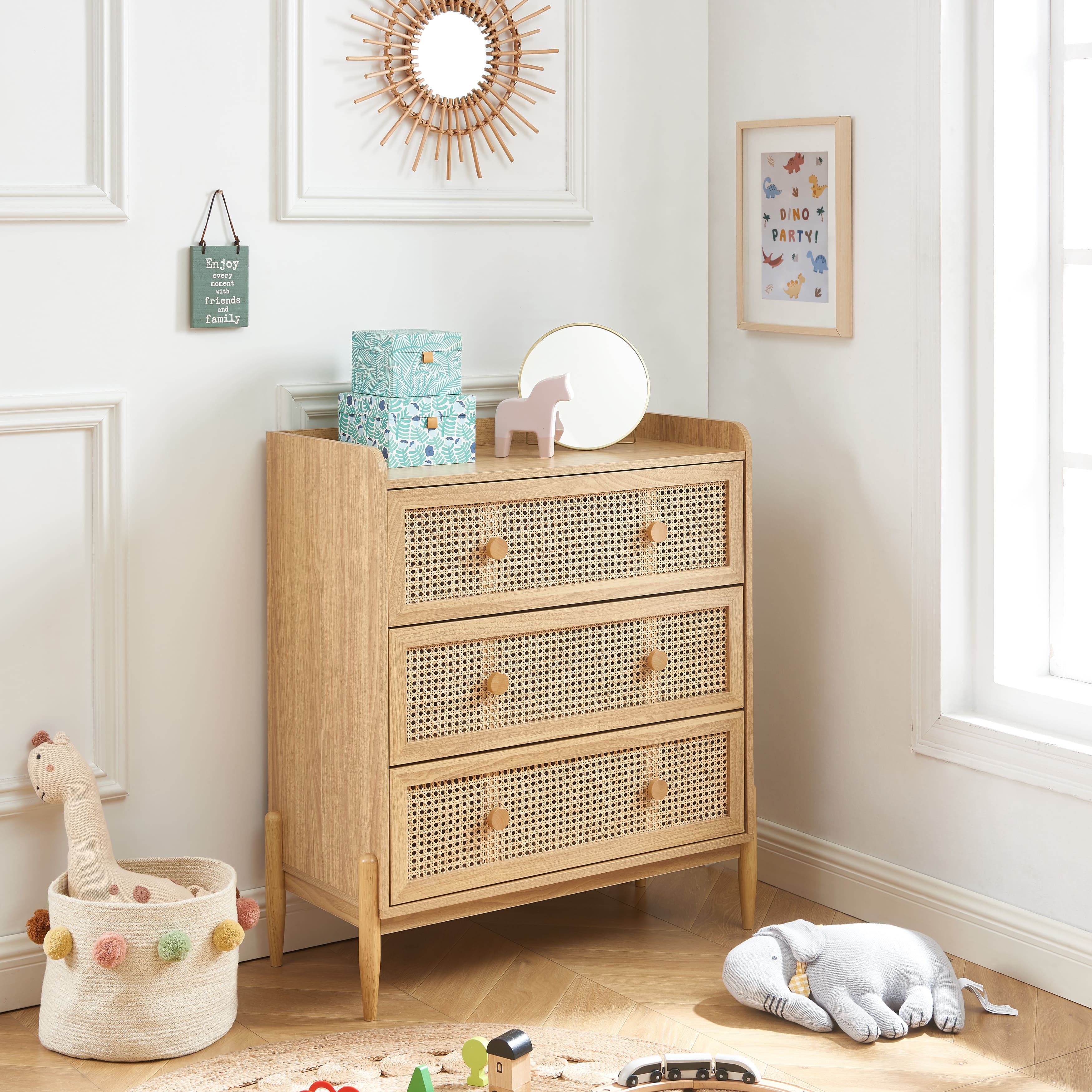 Commode enfant PABLO 3 tiroirs cannage rotin et effet bois 80cm