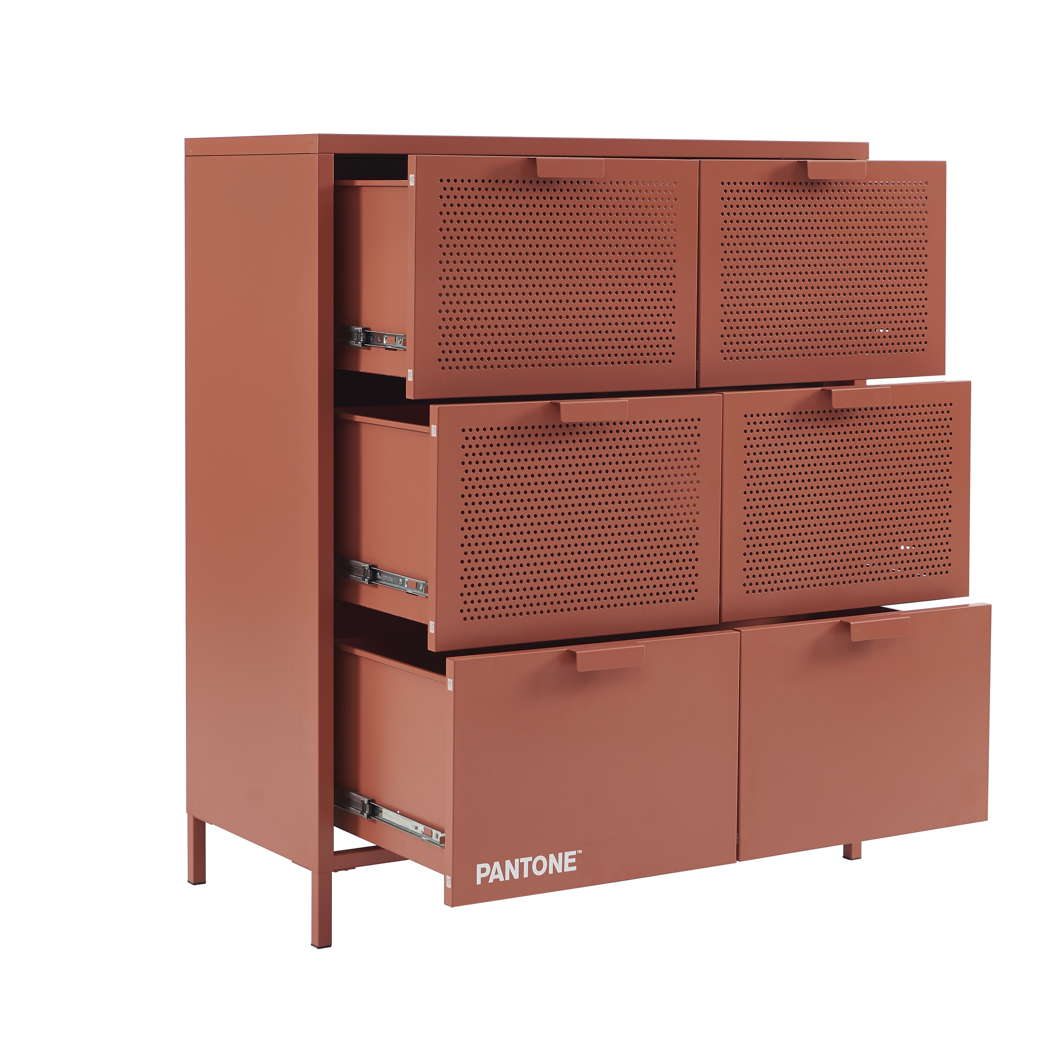 La commode PANTONE est équipée de six tiroirs, offrant ainsi un espace de rangement pratique et organisé pour vos affaires. Les quatre tiroirs du haut ont une façade en métal perforé, ajoutant une touche de texture au design de la commode, tandis que les deux tiroirs du bas ont une façade en métal pleine pour un look plus solide et traditionnel.