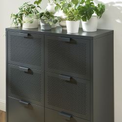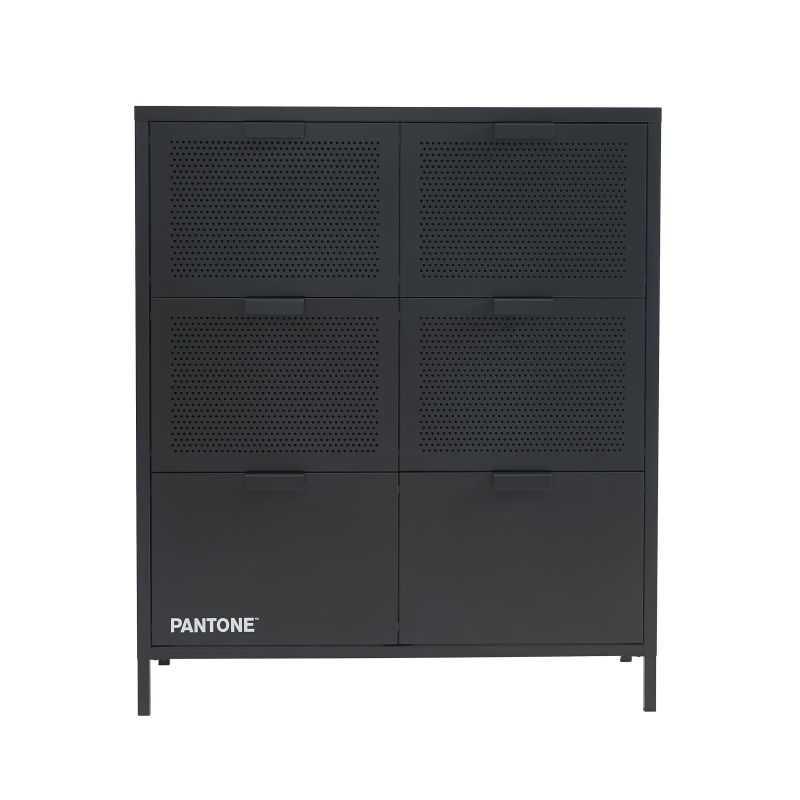 La commode PANTONE est équipée de six tiroirs, offrant ainsi un espace de rangement pratique et organisé pour vos affaires. Les quatre tiroirs du haut ont une façade en métal perforé, ajoutant une touche de texture au design de la commode, tandis que les deux tiroirs du bas ont une façade en métal pleine pour un look plus solide et traditionnel.