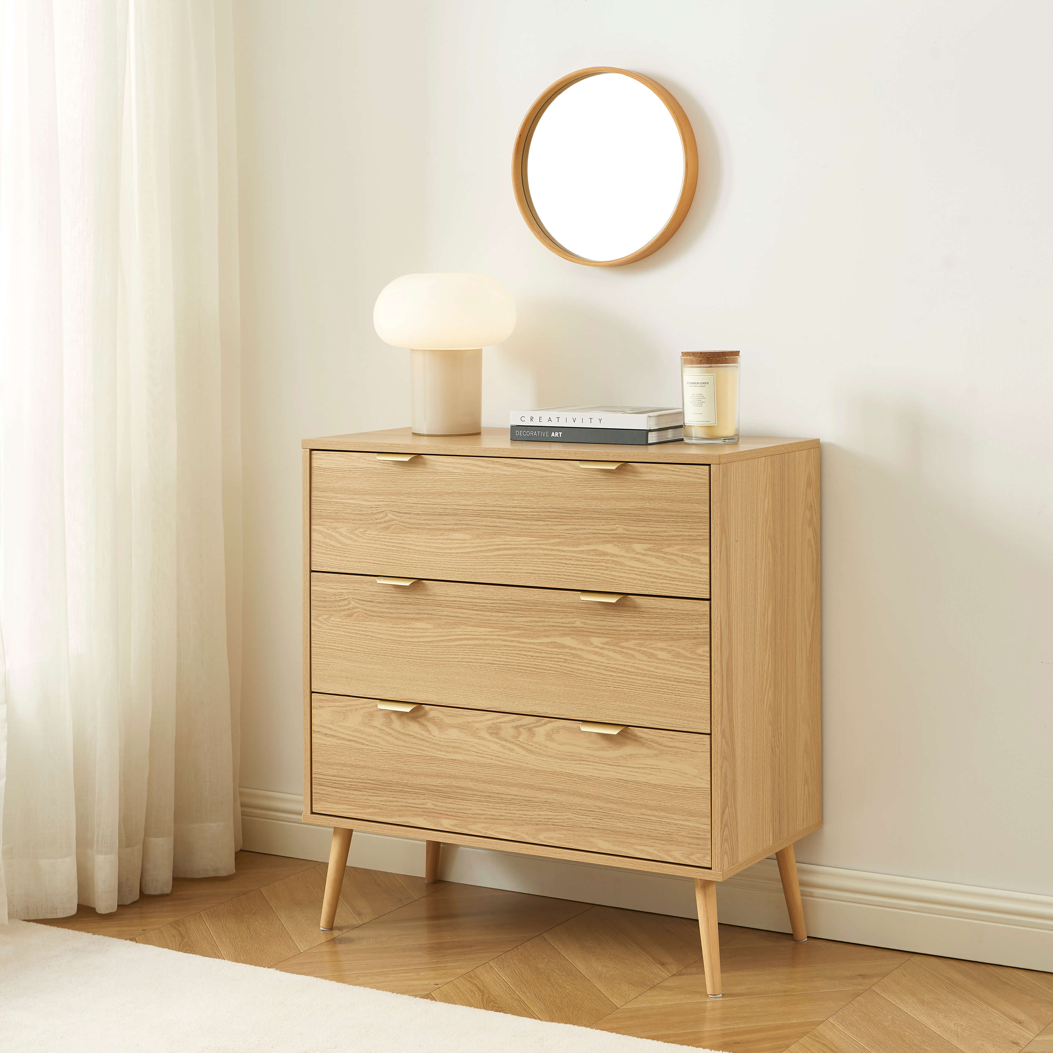 La structure en panneaux de particules et MDF est habillée d’un revêtement effet bois, offrant un rendu naturel et élégant. Les pieds en eucalyptus massif renforcent le caractère authentique de l’ensemble. Les poignées en métal doré apportent une touche chic et subtile qui vient rehausser l’esthétique globale.