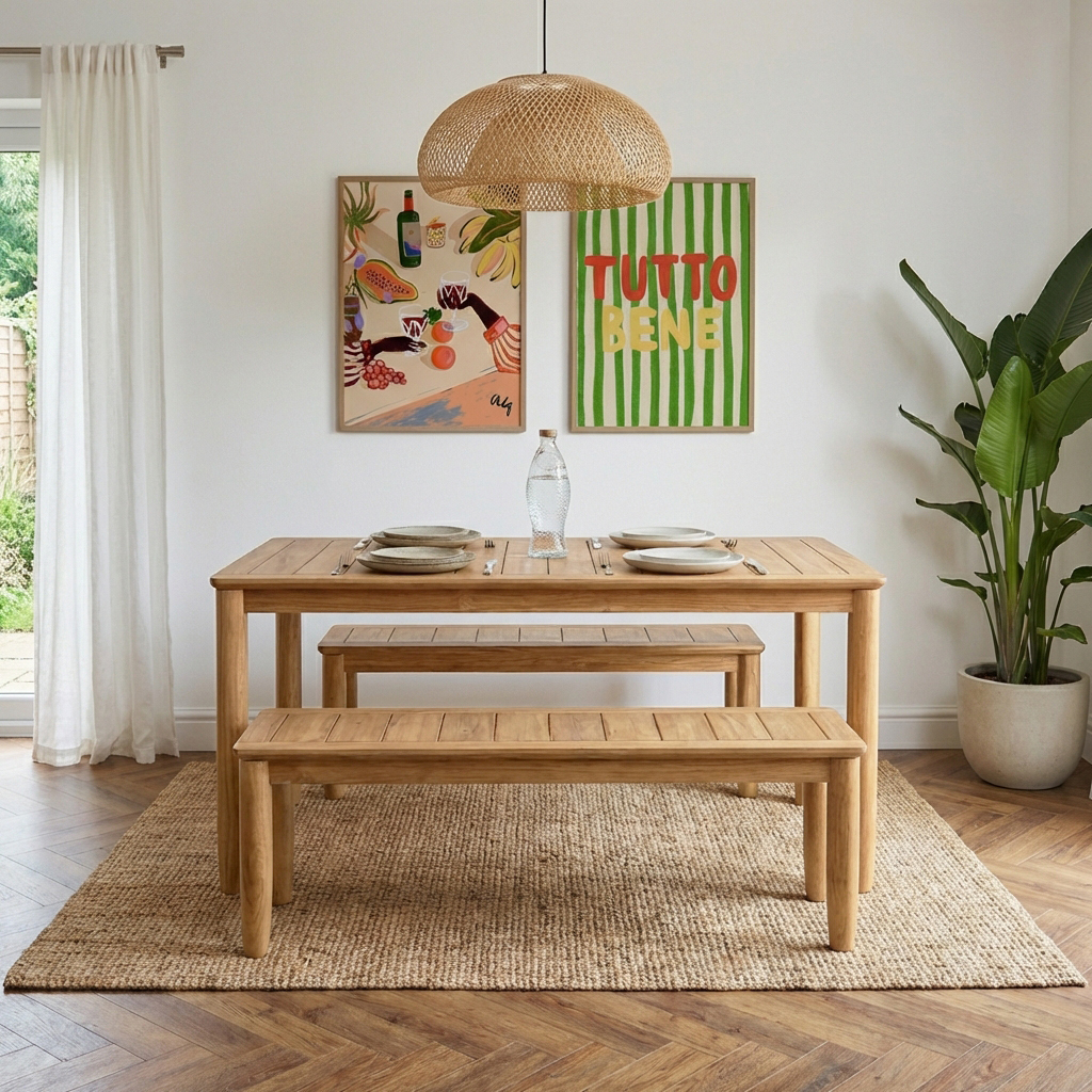 Découvrez notre ensemble table et bancs SAFARI en bois de teck, parfait pour accueillir jusqu'à 6 personnes.