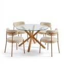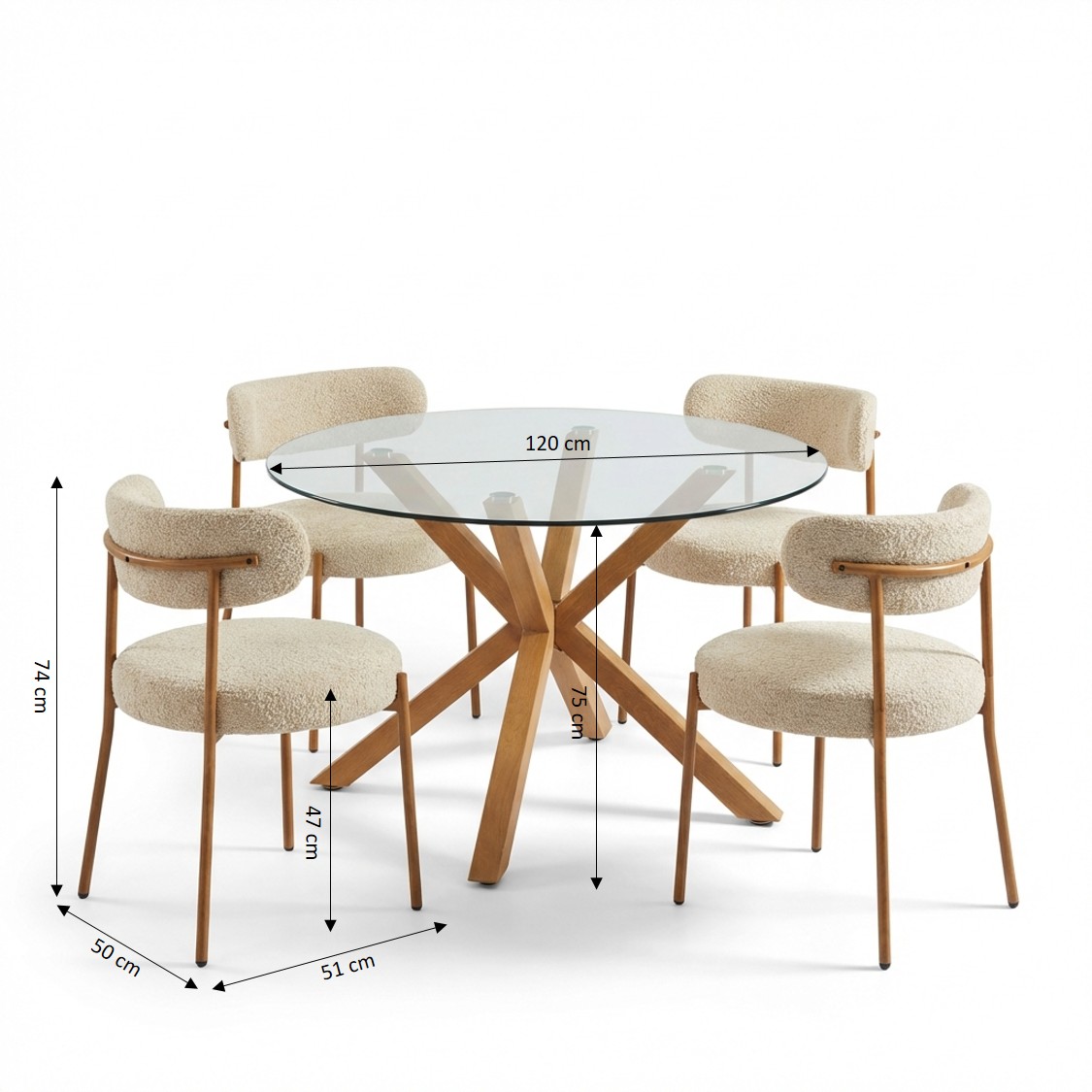 L’ensemble repas HARRY et NOA associe une table ronde en verre élégante à quatre chaises en tissu beige confortables. Un duo idéal pour créer un espace repas convivial.